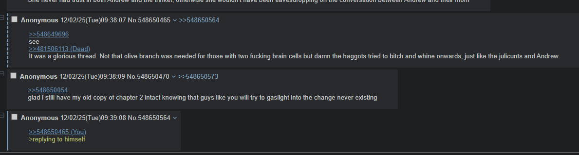 >>548641215>Except drop out of high school because big bro wasn't around and make herself unemployable outside of prostitutionAnother proof of Andrew being a faggotAlso women shouldn't be studying or working, based Ashley>>548641061>I like how it has sparked a debate with still no consensus in sight about whether the screenshots are from Burial or Dec4y.? Wasnt it confirmed already its Decay and Burial ended on SnS?
