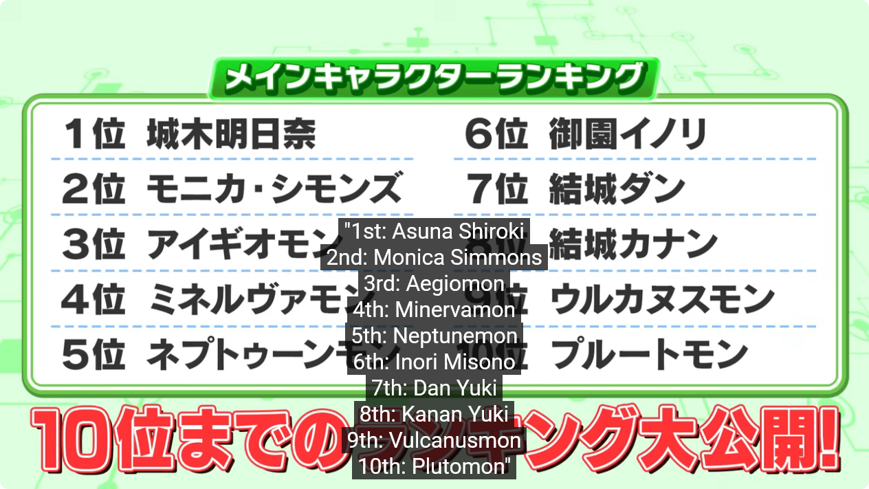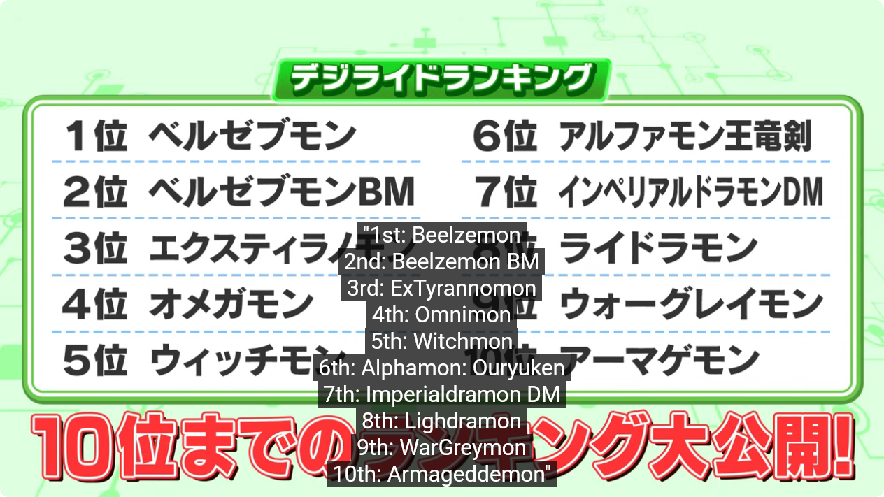>>548657520They were reading out the results of the official poll they had a while back on Terrisuke's channel.We also got more details about the DLCs, they're going to be stand alone episodes featuring a human and the new digimon against what I assume to be Parallelmon; Each DLC is one hour worth of story content and you don't have to get them all just the one you want.
