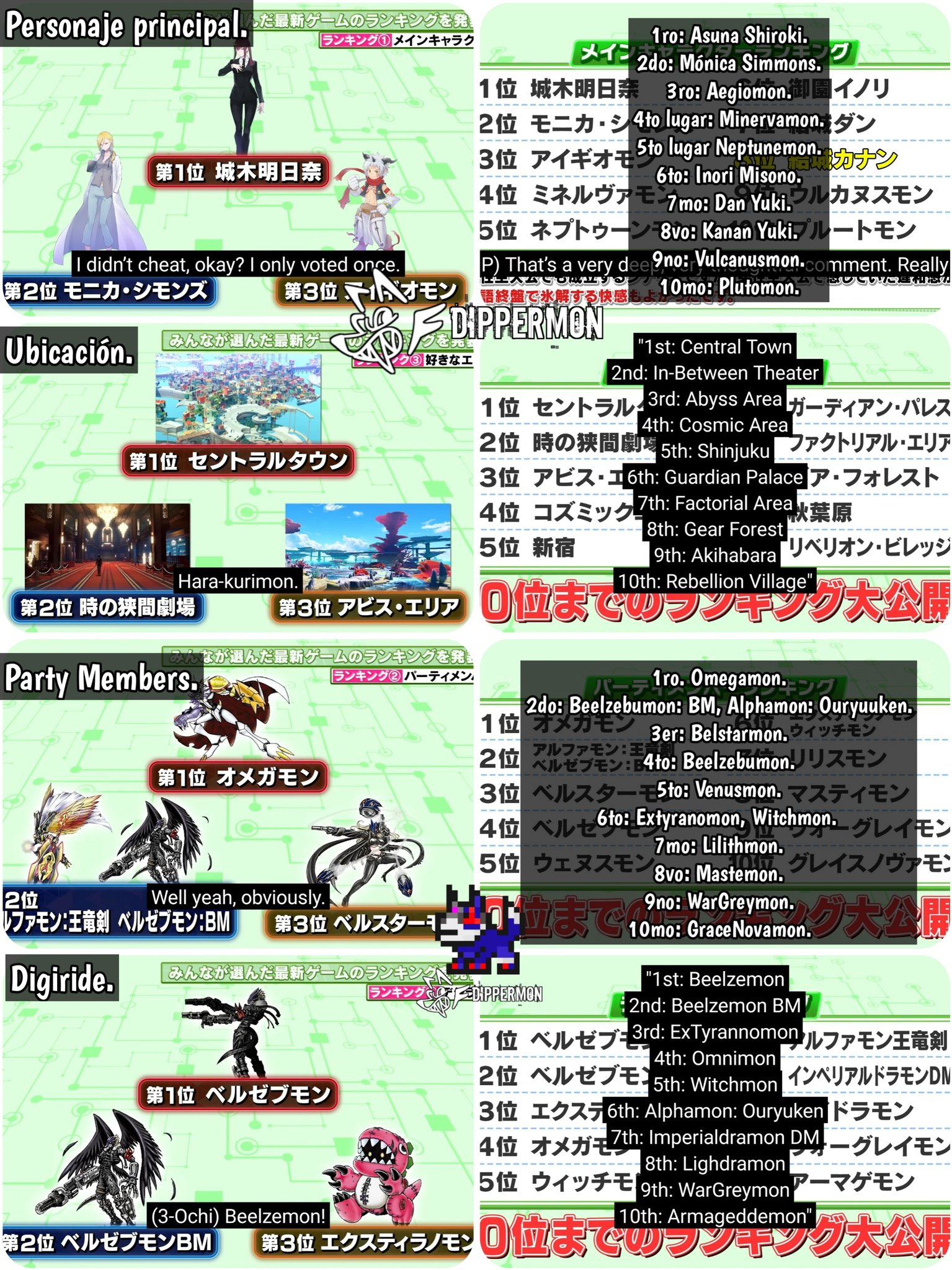 >>548663453Outside Asuna the top characters make sense. Ones with stand out personalities or have a long time to form bonds with.Areas also make sense because Central Town sells the idea of the game, you end up in the Theater a lot, Abyss Area is beautiful, etc. Only thing that is surprising thing to me is Guardian Palace being above Factorial Area.Party Members is usual guys, the runaway success Beelstarmon, a couple with really great DigiRides, and the amazing healer. Nothing is really weird abut these. Digiride is similar. Top guys, inside the suit or on broom, and other main character guys who are good at carrying. Armageddmon is one I also liked a lot.