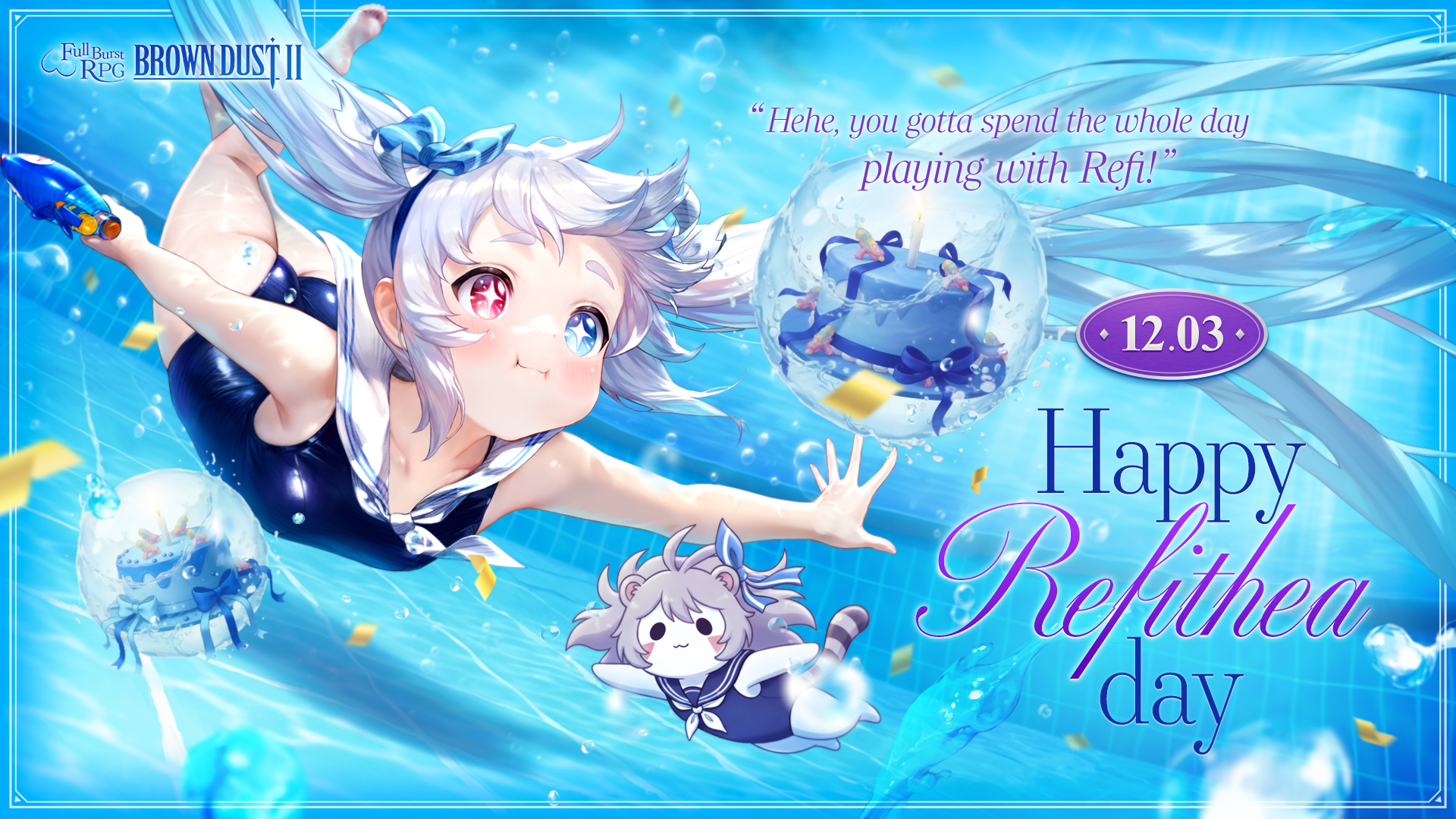 It’s Refithea’s birthday, our never-tiring water park fairy! > “Yaaay, it’s Refi's birthday!> Huh? What do Refi want as a present?> Cute swimsuits, floaties, and new water guns…> Refi already got those from other people!> Instead, how about… you give your whole day to Refi?> Let’s play at the water park all day long, then come back and take a cozy nap together~> Really? You will? Ehehe, that’s the best birthday present ever!”Maybe the present Refithea needs most… is actually you. Let’s give her the best day ever together!