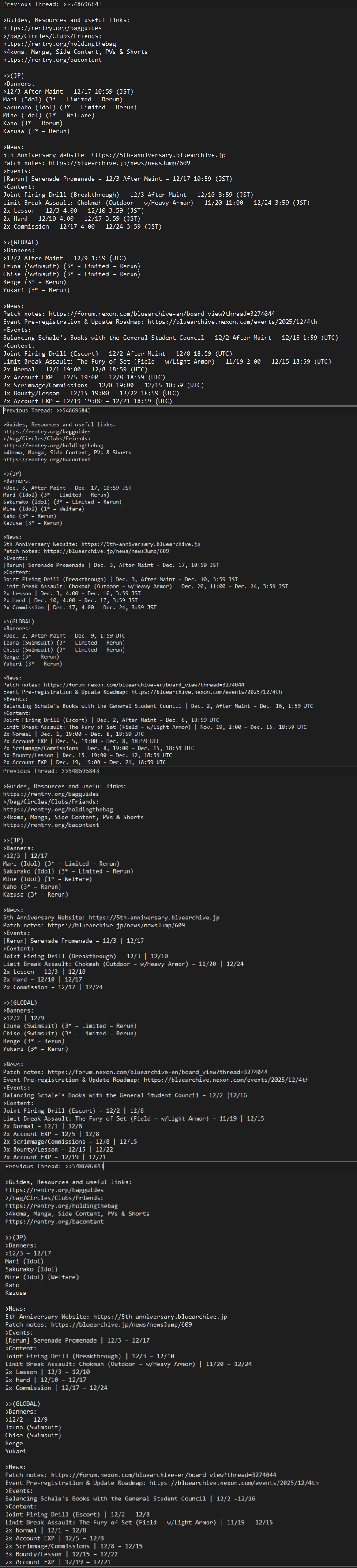 Previous Thread: >>548660070>Guides, Resources and useful links:https://rentry.org/bagguides>/bag/Circles/Clubs/Friends:https://rentry.org/holdingthebag>4koma, Manga, Side Content, PVs & Shortshttps://rentry.org/bacontent>>(JP)>Banners:>12/3 (Wed) After Maint – 12/17 (Wed) 10:59 (JST)Mari (Idol) (3* – Limited – Rerun)Sakurako (Idol) (3* – Limited – Rerun)Mine (Idol) (1* – Welfare)Kaho (3* – Rerun)Kazusa (3* – Rerun)>News:5th Anniversary Website: https://5th-anniversary.bluearchive.jpPatch notes: https://bluearchive.jp/news/newsJump/609>Events:[Rerun] Serenade Promenade – 12/3 (Wed) After Maint – 12/17 (Wed) 10:59 (JST)>Content:Joint Firing Drill (Breakthrough) – 12/3 (Wed) After Maint – 12/10 (Wed) 3:59 (JST)Limit Break Assault: Chokmah (Outdoor – w/Heavy Armor) – 11/20 (Thu) 11:00 – 12/24 (Wed) 3:59 (JST)2x Lesson – 12/3 (Wed) 4:00 – 12/10 (Wed) 3:59 (JST)2x Hard – 12/10 (Wed) 4:00 – 12/17 (Wed) 3:59 (JST)2x Commission – 12/17 (Wed) 4:00 – 12/24 (Wed) 3:59 (JST)>>(GLOBAL)>Banners:>12/2 (Tue) After Maint – 12/9 (Tue) 1:59 (UTC)Izuna (Swimsuit) (3* – Limited – Rerun)Chise (Swimsuit) (3* – Limited – Rerun)Renge (3* – Rerun)Yukari (3* – Rerun)>News:Patch notes: https://forum.nexon.com/bluearchive-en/board_view?thread=3274044Event Pre-registration & Update Roadmap: https://bluearchive.nexon.com/events/2025/12/4th>Events:Balancing Schale's Books with the General Student Council – 12/2 (Tue) After Maint – 12/16 (Tue) 1:59 (UTC)>Content:Joint Firing Drill (Escort) – 12/2 (Tue) After Maint – 12/8 (Mon) 18:59 (UTC)Limit Break Assault: The Fury of Set (Field – w/Light Armor) – 11/19 (Wed) 2:00 – 12/15 (Mon) 18:59 (UTC)2x Normal – 12/1 (Mon) 19:00 – 12/8 (Mon) 18:59 (UTC)2x Account EXP – 12/5 (Fri) 19:00 – 12/8 (Sun) 18:59 (UTC)2x Scrimmage/Commissions – 12/8 (Mon) 19:00 – 12/15 (Mon) 18:59 (UTC)3x Bounty/Lesson – 12/15 (Mon) 19:00 – 12/22 (Mon) 18:59 (UTC)2x Account EXP – 12/19 (Fri) 19:00 – 12/21 (Sun) 18:59 (UTC)