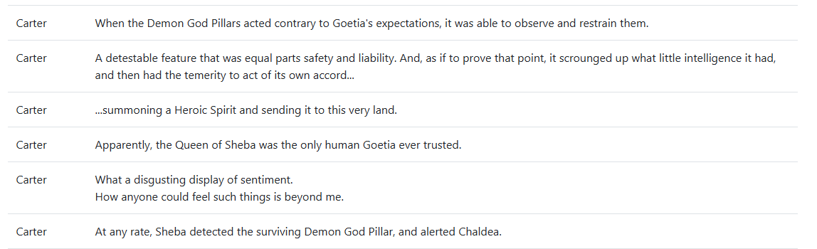 >>548749410My eyes skim over this shit formatting to argue from my phone.Yes, I misremembered that Lev's name was mentioned. But the scene in question can be inferred easily from the evidence.Da Vinci said it was Sheba Lens that summoned Circe, and Circe was only a second choice after Sheba. Raum said too. But in a discussion about their summons, Circe is aware that someone summoned them and messed up, that's why Sheba became Tituba, and Sheba apologizes but can't answer who summoned them. And when Robin presses on, her answer is "I don't want to make enemies out of you."Sheba was trusted by Goetia---this means the hive of demon gods, as you know, they weren't an individual until the finale of the Temple where they broke off, including the control center. Now, Raum can show his personal disdain for her, but Flauros literally named his greatest creation after Sheba. Not Solomon--SHEBA.This scene was never explained or elaborated on after. The reason why Sheba is so sketchy about her summoning is never revealed. If this was Goetia who summoned her, why link the catalyst explicitely to Lev's creation? No need at all. That was foreshadowing Flauros' presence after the temple.