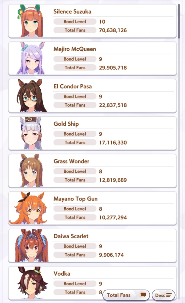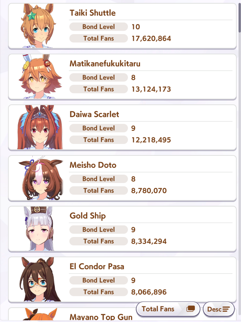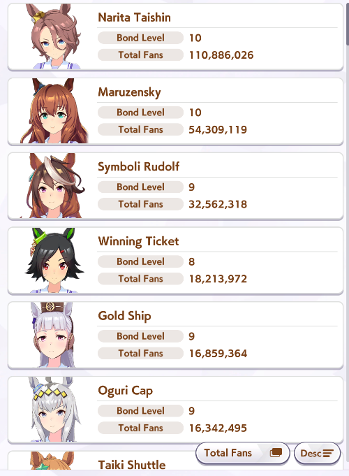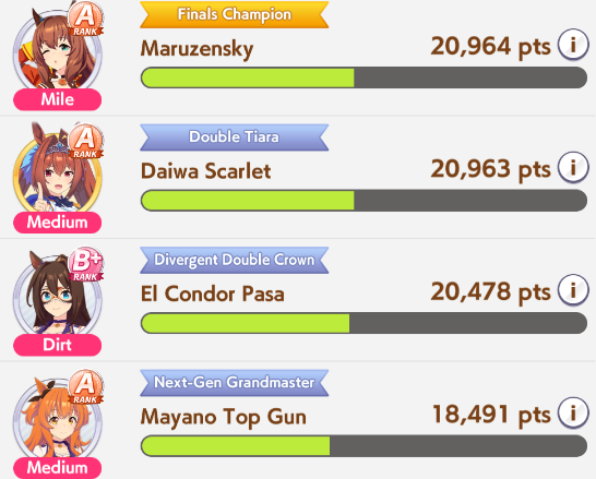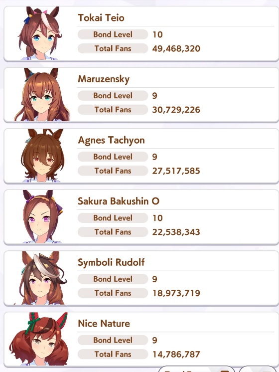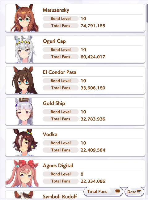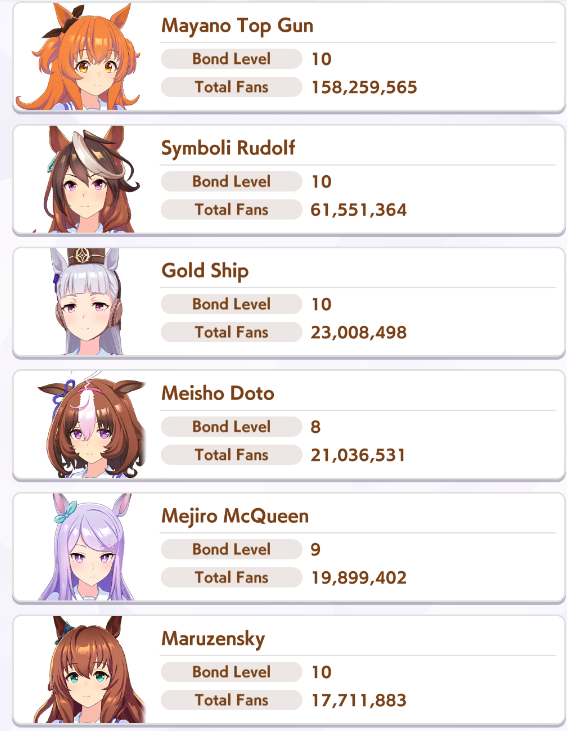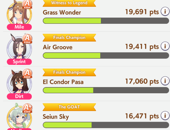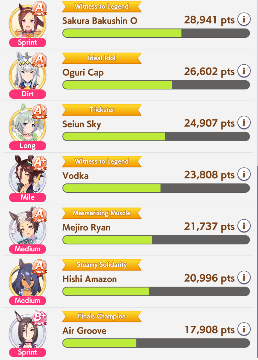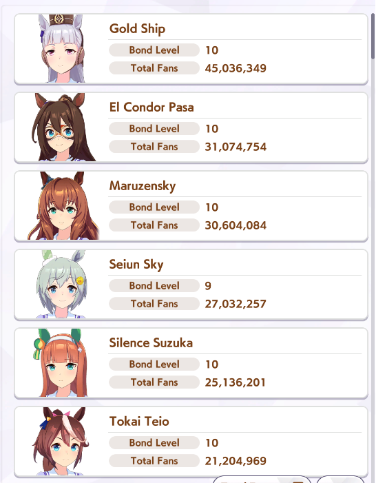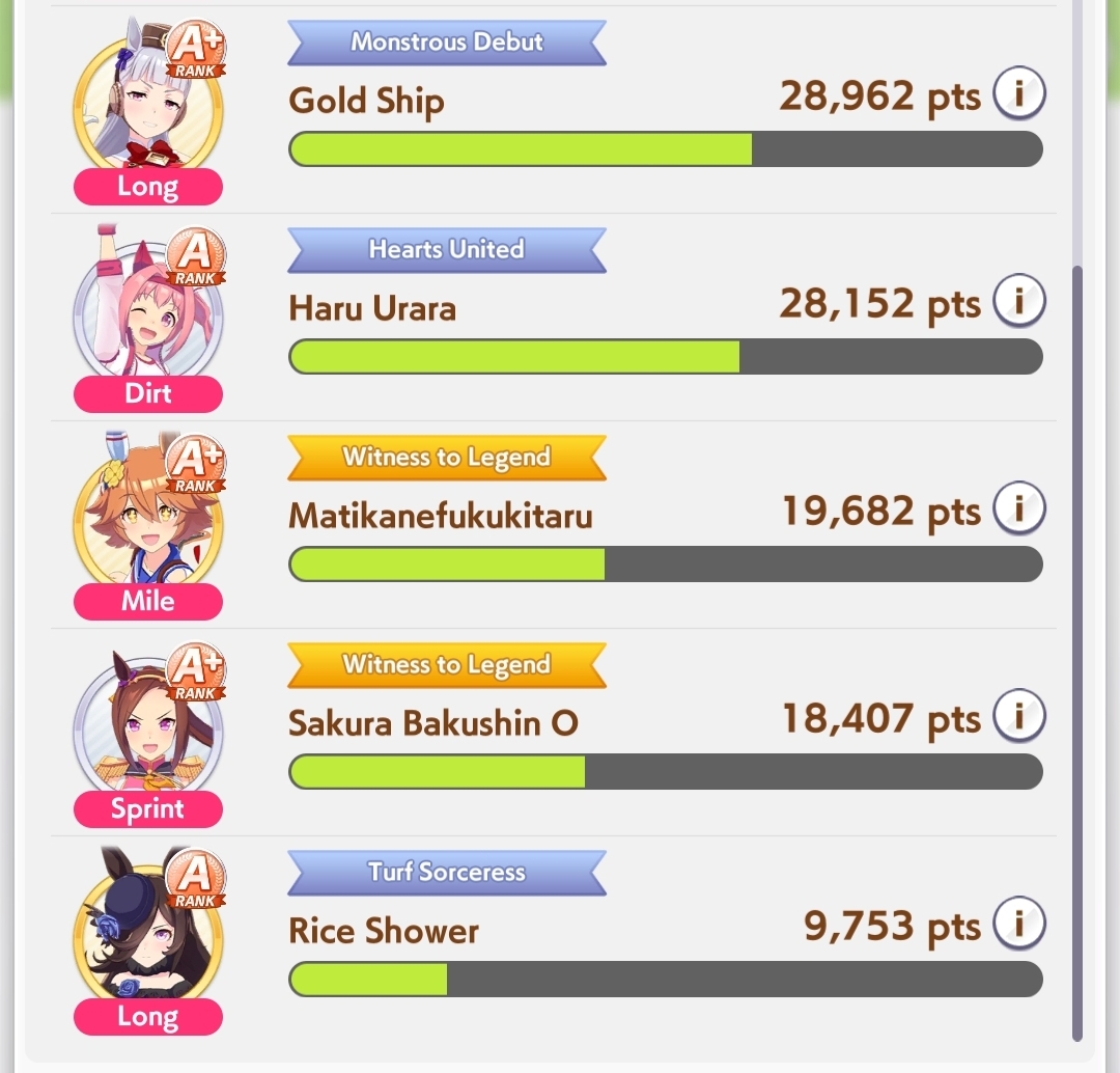 >>548797684it's kind of disheartening to see people with one uma significantly higher than all of mine combined.Daiwa is only that high for parents, and gold ship is mostly from her event a while back