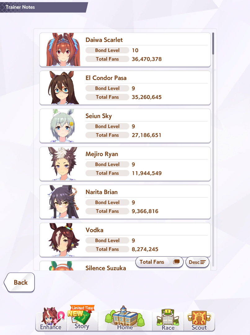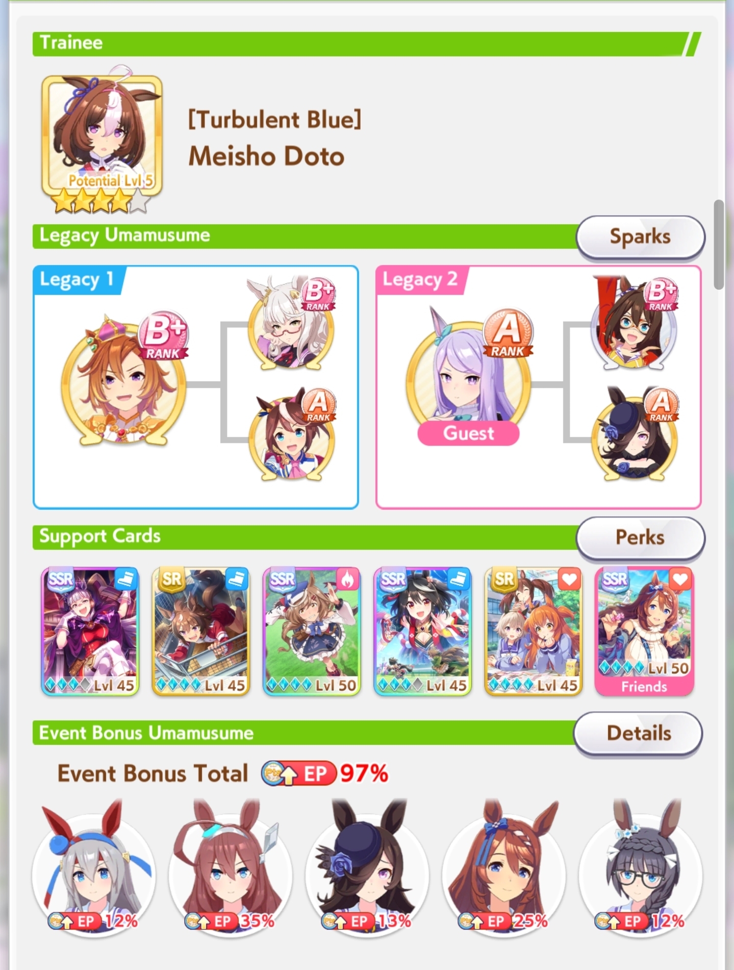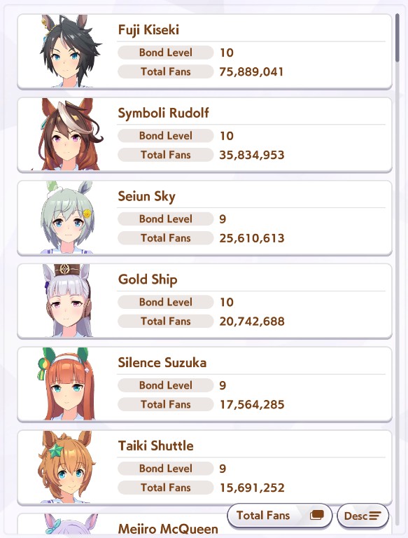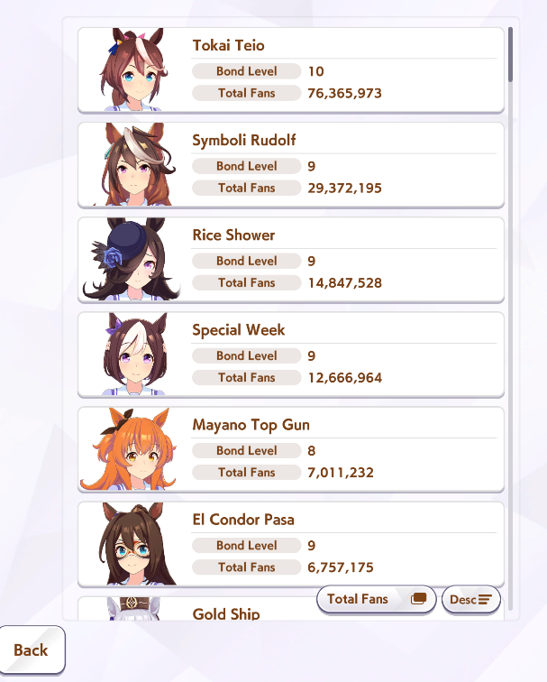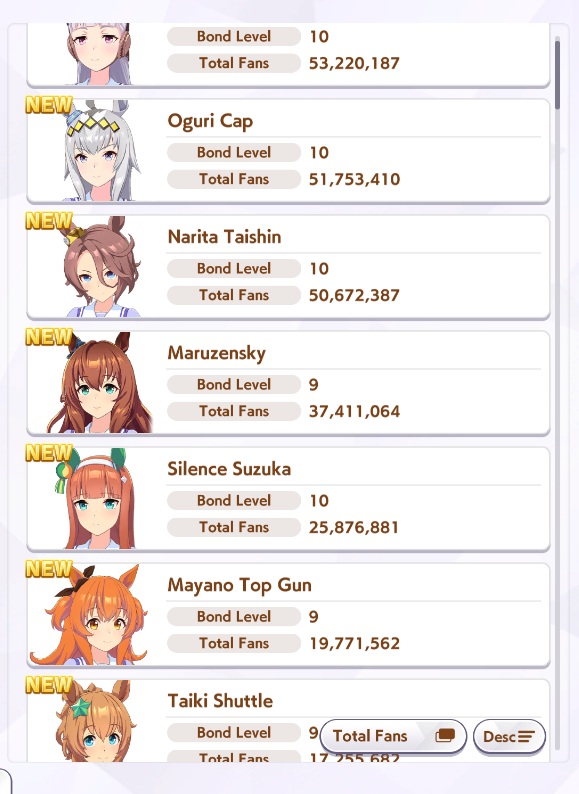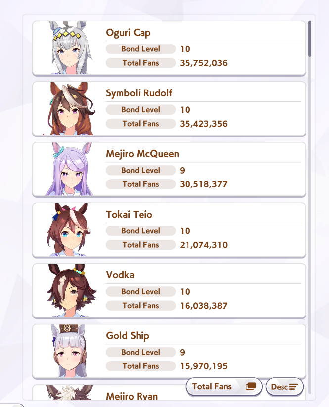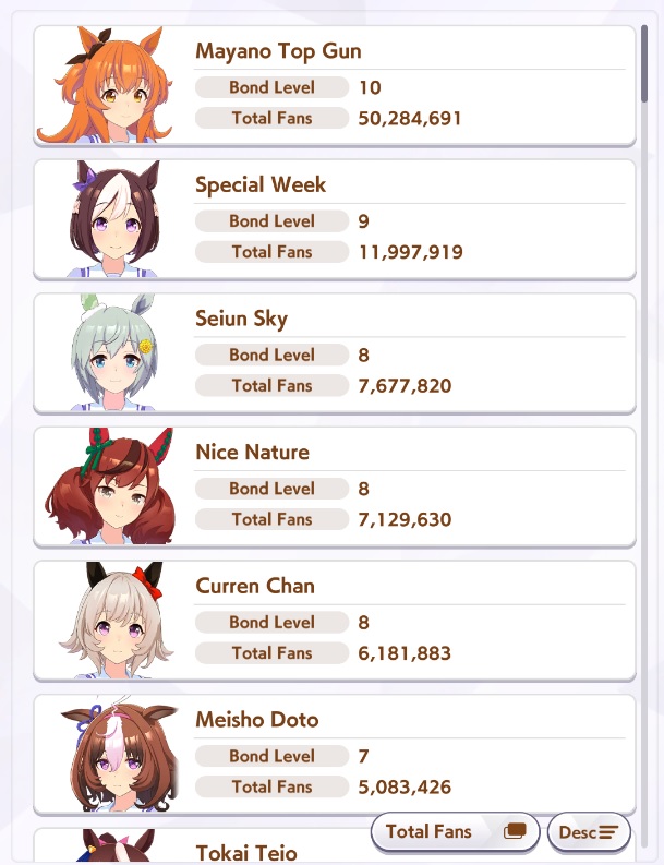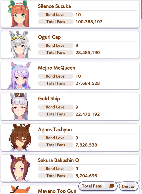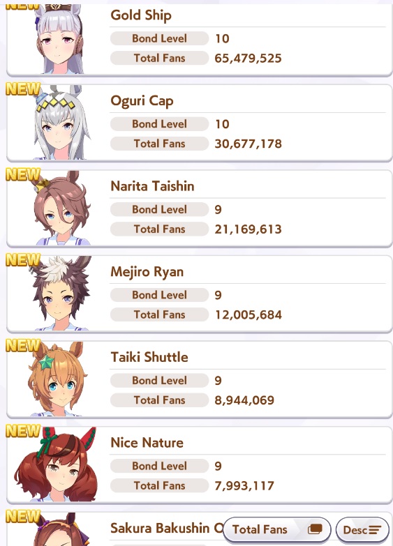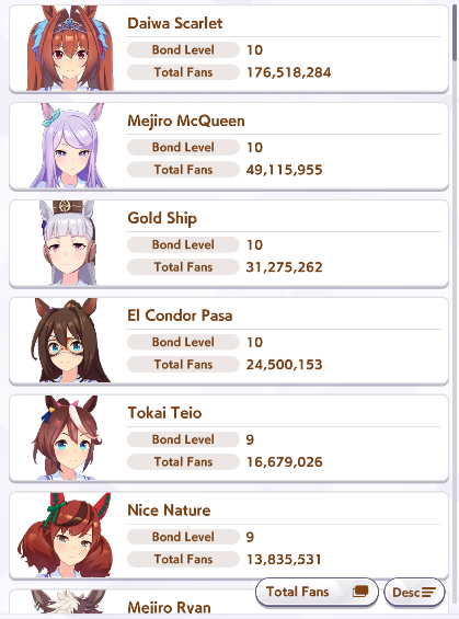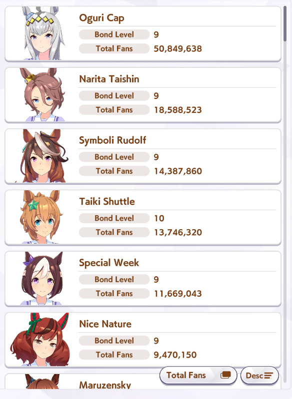 >>548797684it's kind of disheartening to see people with one uma significantly higher than all of mine combined.Daiwa is only that high for parents, and gold ship is mostly from her event a while back