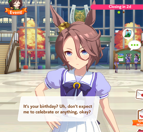 Previous: >>548745768>Global Game NewsCurrent Scenario: Aoharu Hai aka "Unity Cup"Current Specials Missions: Half Anniversary Part 2+3Current Rate Up: Rice Shower (3* Alt), Super Creek (3* Alt), Tamamo Cross (SSR), Zenno Rob Roy (SSR), Kawakami Princess (3*), Seiun Sky (SSR), Yaeno Muteki (SSR)12/04 & 22 - Legend Races12/08 - Libra Cup - Kyoto Turf 3000m12/14 - Autumn Event12/18 - Kitasan Rerun12/24 - Fuji Event12/28 - Scorpio Cup - Tokyo Turf 2000mhttps://umamusume.com/news/100040/https://pages.snep.pw/uma/anni-skill-changes/>JP Game NewsCurrent Rate Up: Christmas Nakayama Festa (3* alt), Christmas Dream Journey (3* Alt), Gold Ship (SSR), Fenomeno (SSR)New Scenario "Yukoma Hot Spring" releasedTimeline: https://uma.moe/timeline>IP NewsUmamusume Cinderella Gray 2nd season started weekly airings on 10/5>Thread Clubshttps://rentry.co/umaglobalclublistYou must be E3 (20k points) to join a circle. Apply with /uma/ or /vg/ in your profile or post ID in the thread.>All Guides & Resourceshttps://rentry.org/uma26Game databasehttps://gametora.com/umamusume (Click the gear to switch between JP / global server info)A basic guide for newfagshttps://rentry.org/umaglobalFind networks if your region is blocked from the game or clienthttps://www.umavpn.top/93Seiyuu & Concertshttps://rentry.org/umstUma storieshttps://umareader.idsmile.xyz/