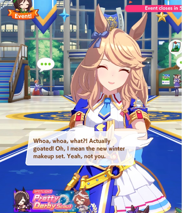 I was looking through pictures of Gold Ship on netkeiba recently and I had a sudden realization that he's wearing a bridle in 95% of the existing photos of him. I think it might be glued to his head. I now understand why the uma version (almost) never takes her hat off.
