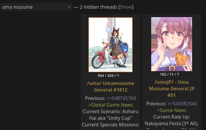 >>548774896>one S club has weekly club races, carat giveaways, and fun little extras from the danchou like comics on any humorous happenings at the end of the month and music playlists>an interesting way of doing “quota” that encourages cooperation>anon joins the one with the midmonth penis inspectionYou only have yourself to blame.the truth is we would have 4 fucking S clubs if the anons trying to carry their B club to A finally moved on>>548775137UMADash has touched the golden land for a while before but they don’t have the quota or force in place to keep it and I’m not sure what the Danchou wants to do about it if anything