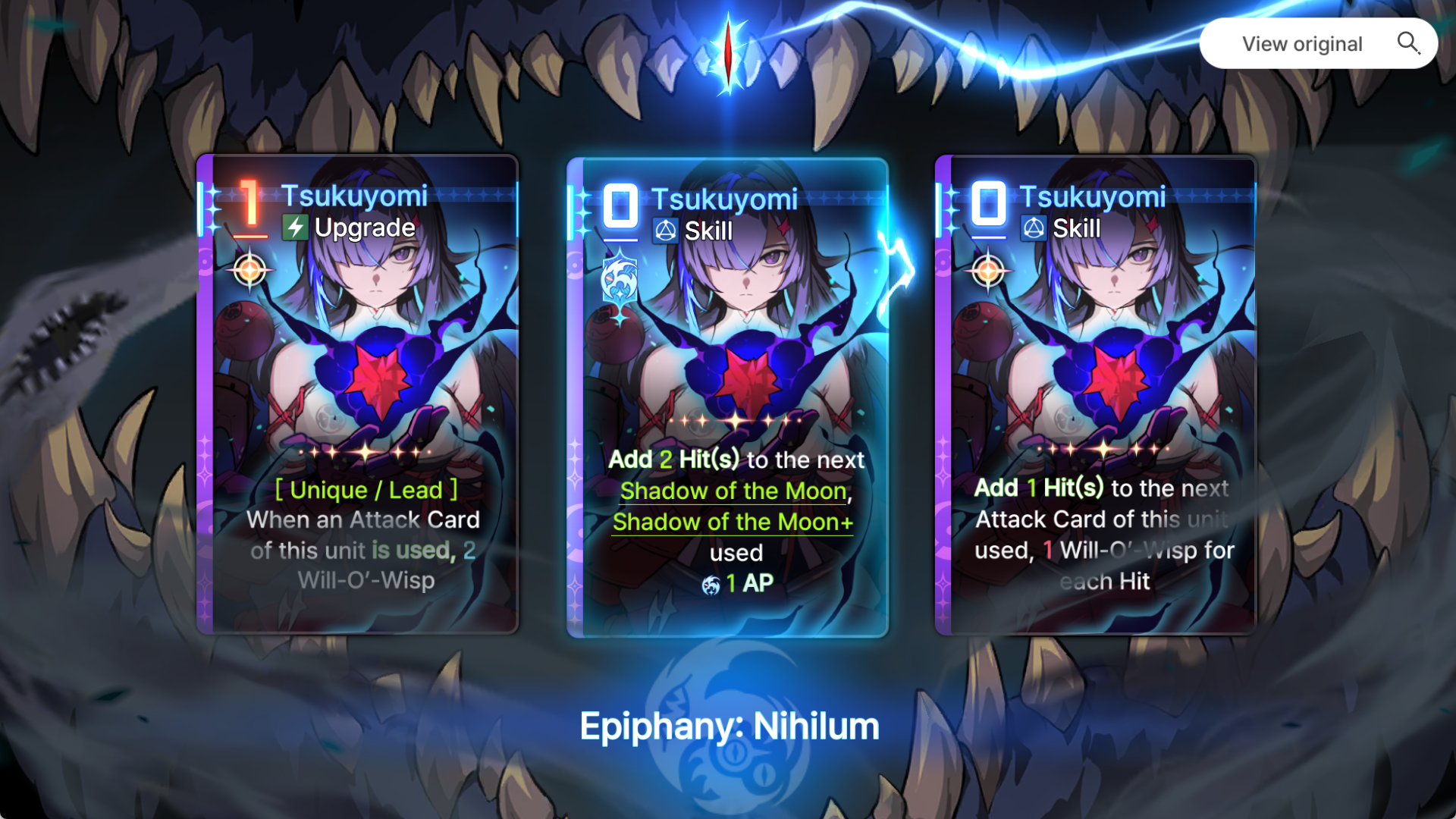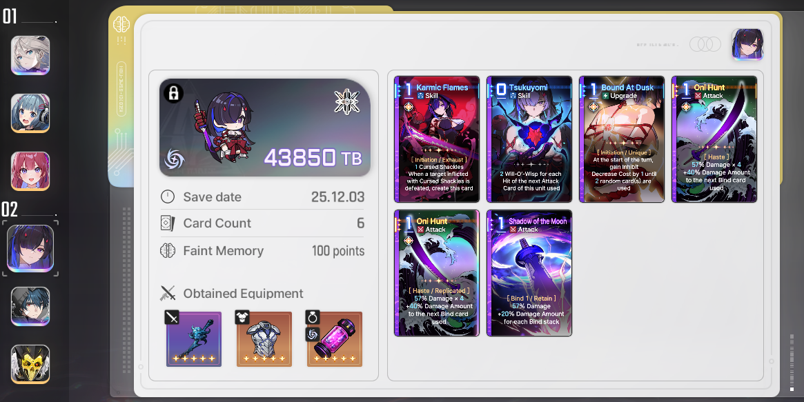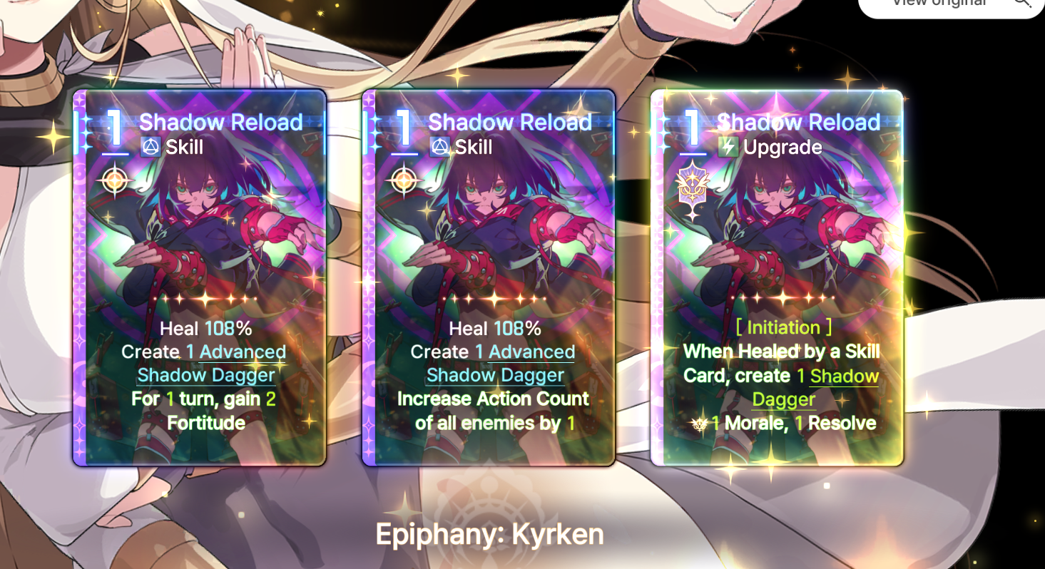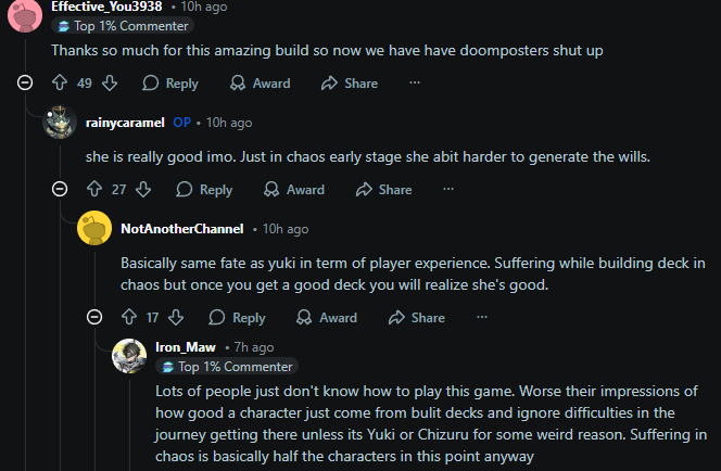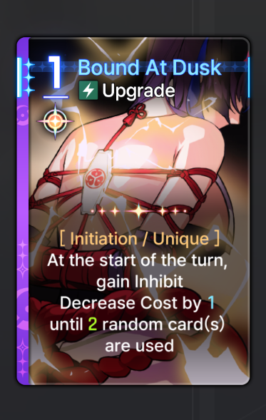 The only part of Chizuru's kit that bothers me is the Cursed Shackles debuff not automatically moving to a different enemy when the current one dies. No, the skill epiphany is not a good solution. It's common to kill an enemy with your last AP and then not be able to play it before the turn ends.Ideally, they make Shackles auto-transfer and simply replace that epiphany with another one that benefits from being used on something already-shackled.Sub-optimally, they could reduce the skill epiphany to 0-cost, but then it feels like Yet Another Necessary Epiphany.They could also just give it retain, but that would still feel like shit to play with.