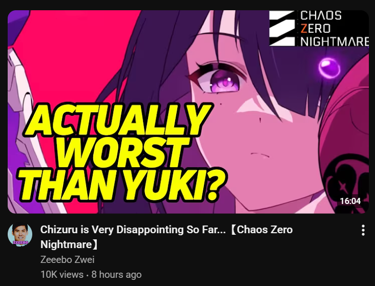 The Nightmare is Ongoing... >>548814829>12/03 (Wed) Updatehttps://page.onstove.com/chaoszeronightmare/en/view/11402378>Useful Links and Resourceshttps://rentry.org/xtb66f3ihttps://wiki.e7bot.top/#/czn/combatant>Current/Upcoming Featured BannerChizuru - Psionic - Void | Starting December 3rd>Current/Upcoming Content/EventsGalactic Disaster - Forbidden Catalysts - Season 1 | Until January 13th 2026Guardian of the Ark - Policy Event | Until December 3rdGalactic Disaster Dispatch - Login Event | Until November 25th>Developer Note: Upcoming Improvements in the Second Update:https://page.onstove.com/chaoszeronightmare/en/view/11319239>Why didn't my Save Data save properly?Save Data uses a points based system. If you go above a certain threshold, your Save Data will be edited.https://rentry.co/cznsavedatahttps://czn-calc.vercel.app/https://euri412.itch.io/save-data-calculatorhttps://czn-save-cal.web.app/