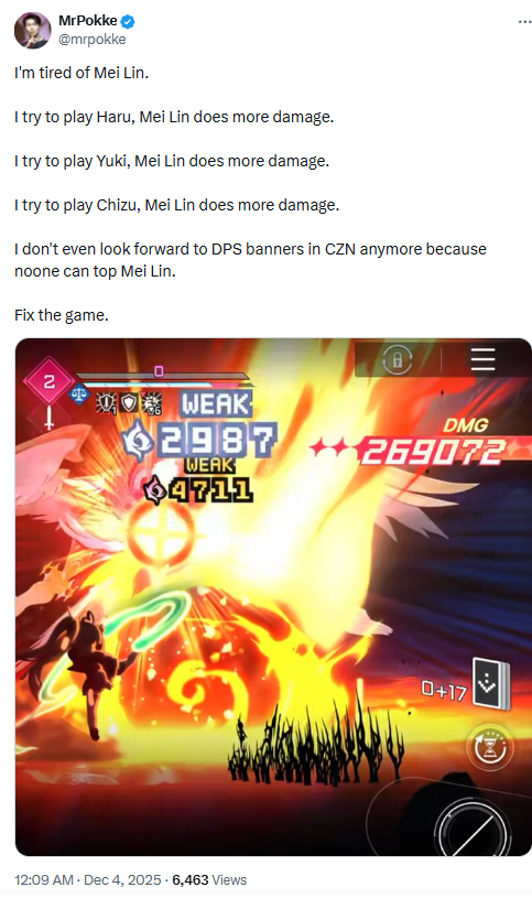 Devs release OP characters way stronger each time>waaaa let me play with all the roster without needing to pull every banneeeeeeerDevs release new normal characters and if they are a bit underpower they fix them at the same time thry gift a lot of tickets in a game based for fun builds with characters>game is doomed EoS shut down and start again.Crybabies