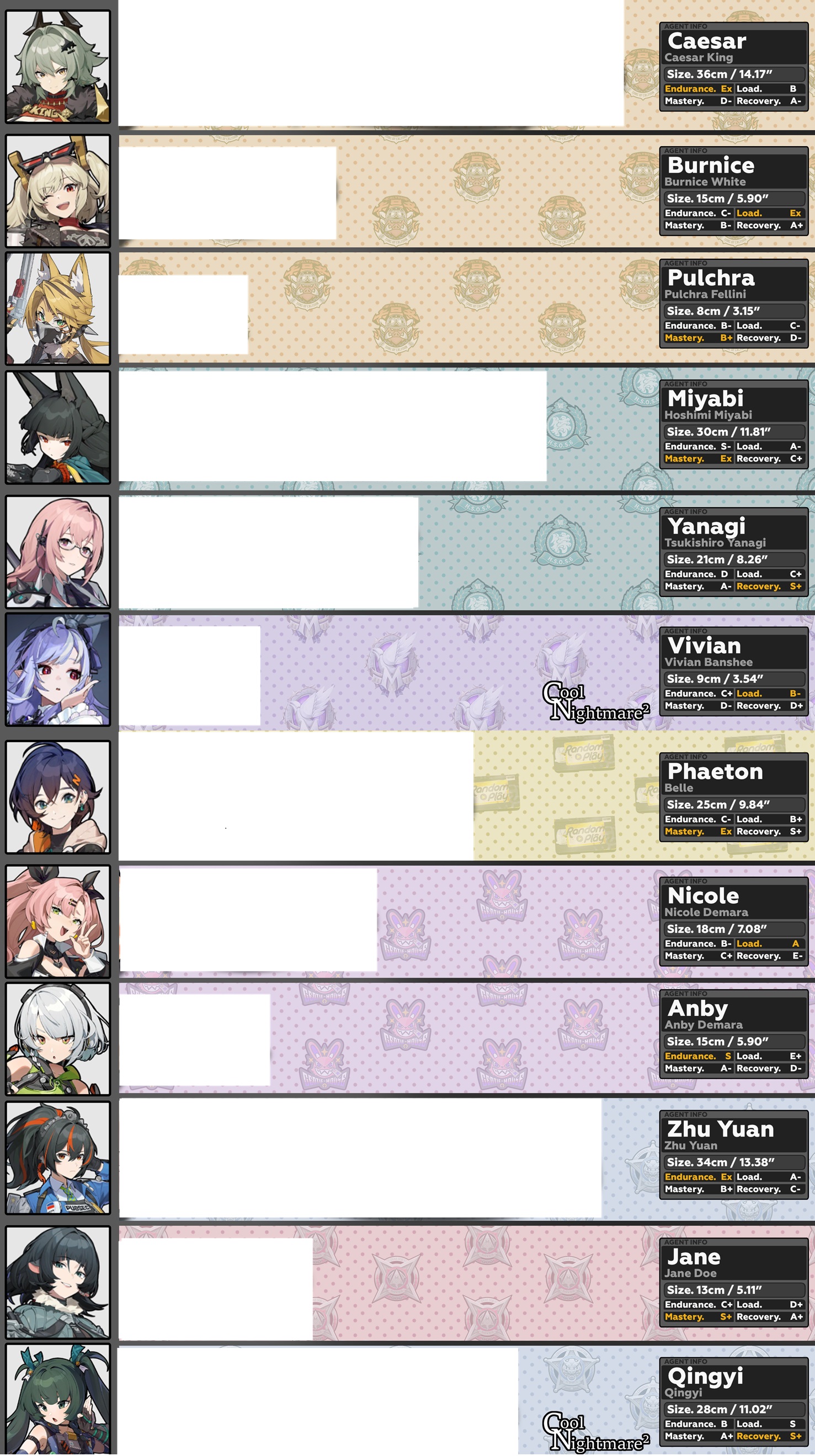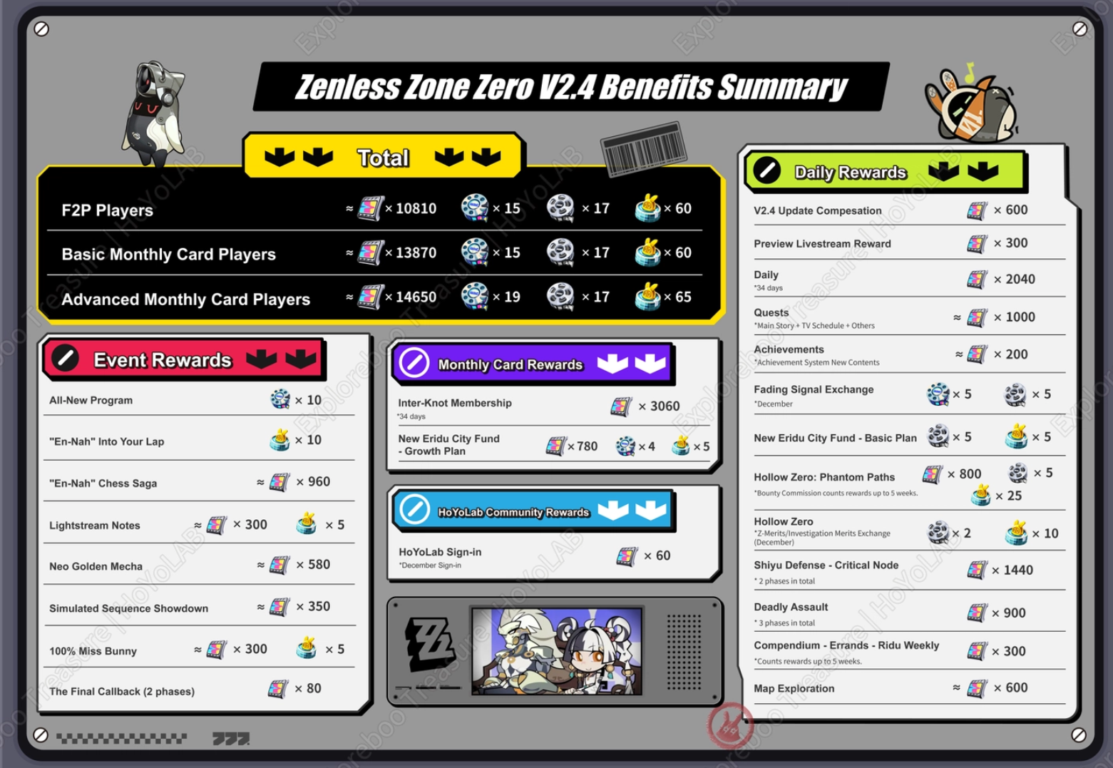 Previous: >>548848656>NewsAgent Record | Ye Shunguanghttps://www.hoyolab.com/article/42397862Agent Record | Zhaohttps://www.hoyolab.com/article/42343300Version 2.4 Special Programhttps://youtu.be/hMZVmJ8ZGto>Newest Trailer/Teaser/Character demohttps://youtu.be/e0LoXFGJjSU (EN)https://youtu.be/2NKK6Mg27XI (JP)https://youtu.be/OosW5OpDSB0 (EN)https://youtu.be/-2G_7DNRcFM (JP)https://youtu.be/_Zo_zbHmOpI (EN)https://youtu.be/begsPfi50BY (JP)>Upcoming Events for 2.4https://zenless.hoyoverse.com/en-us/news/161086All-New Program 11/25 - 12/29"En-Nah" Chess Saga 11/25 - 12/29Neo Golden Mecha 11/28 - 12/29Lightstream Notes 12/03 - 12/29Simulated Sequence Showdown 12/08 - 12/29Advanced Bounty: Area Patrol 12/11 - 12/16"En-Nah" Into Your Lap 12/17 - 12/29100% Miss Bunny 12/17 - 12/29Data Bounty: Combat Simulation 12/24 - 12/29>Redeemable codes (claimable in-game or online)https://zenless.hoyoverse.com/redemptionZENLESSGIFTZZZ24KRAMPUSDialyn1125>Resources and useful linkshttps://rentry.org/zzzlinkshttps://rentry.org/ZZZ-Friendshttps://interknot-network.com>/zzz/ OP pastebin (use this if making new thread):https://pastebin.com/PzbMf13P