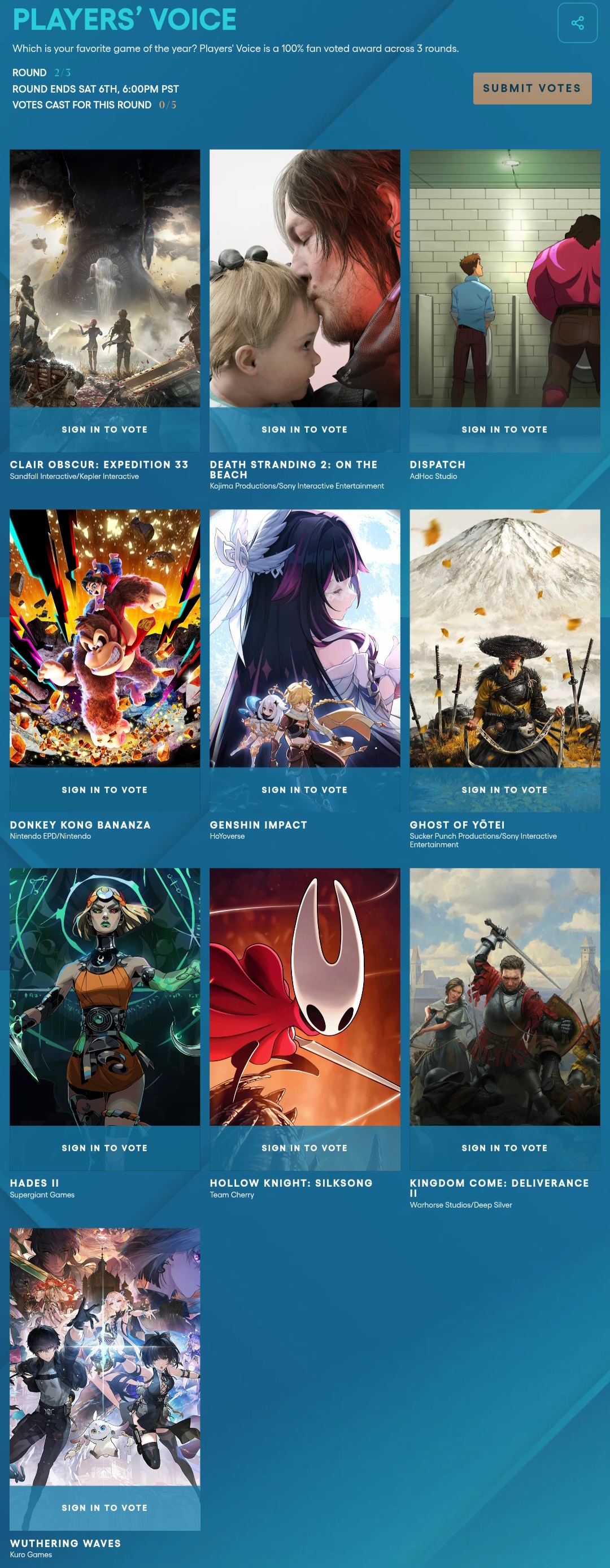 Genshin Impact and Wuthering Waves have been nominated for Round 2 of "The Player's Voice" in TGA awards