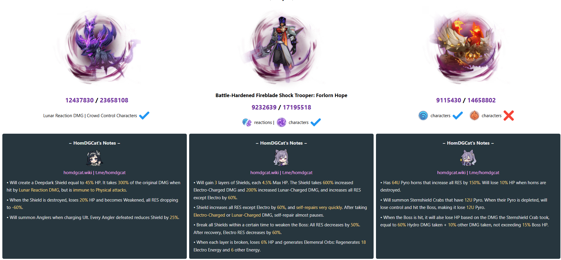 >>548931813I don't know what your problem is. If you're upset I didn't share my teams, I'm not at all confident c0 bina/lauma clears that so I'm still thinking it over. I might shove Ineffa on that boss and brute force the easier shocktrooper boss.More details on the left boss: it's a new boss with a nearly 200k dps check on the surface but there's a shield that tanks even more damage and only transfers ~45% of it back to the boss HP. If it does that shield twice, the total dps check is effectively 295k (45% x 2 + 60% of base hp) before accounting for 3x lunar damage dealt into the shield and the negative res. -60% res is a 30% damage increase, so really it's more like 260k dps. With the damage source being 100% lunar damage, the dps check would be effectively 178k (15% x 2 + 60% of base hp), again before accounting for the -60% res. It summons some anglers that also damage the shield, depending on their own HP and timing of those spawns, that could make the fight a bit easier too.Third boss is free, obviously.