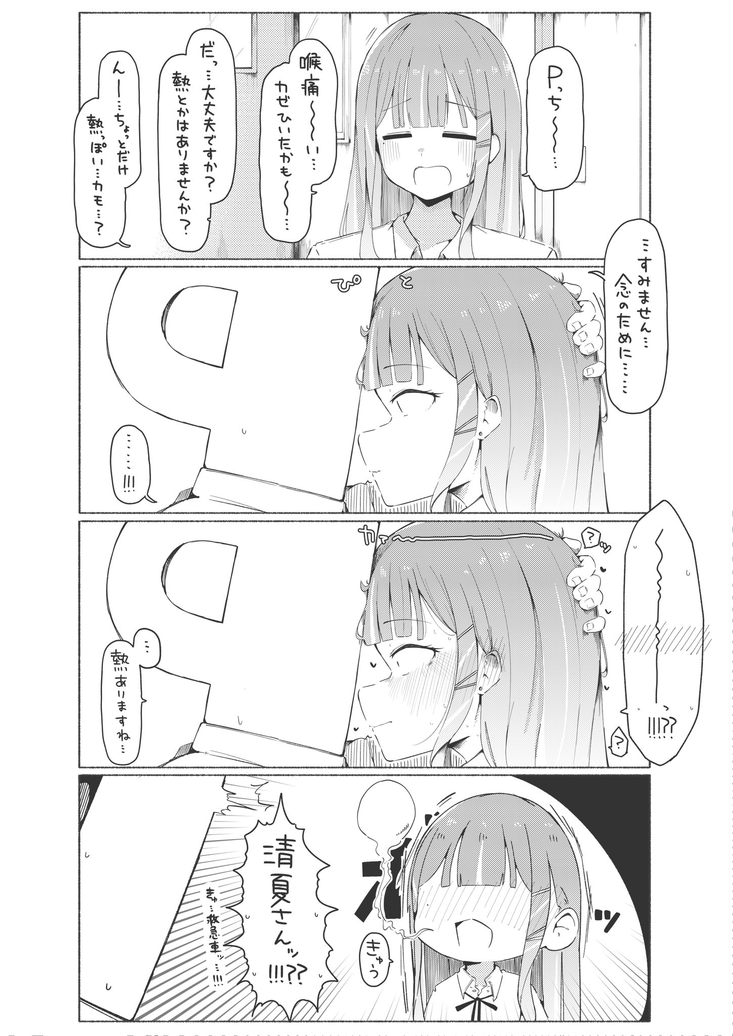 Sumika: P-chi~~...Sumika: My throat hurts~~ I might have a fever~~P-chi: Are you alright? Are you feeling hot?Sumika: I think I'm feeling a bit hot...?P-chi: Excuse me then, Just to make sure...Sumika: .....!!!!!Sumika: ~~~~!!!??P-chi: ...It does feel hotSumika: kyuuP-chi: Sumika-san!!!??
