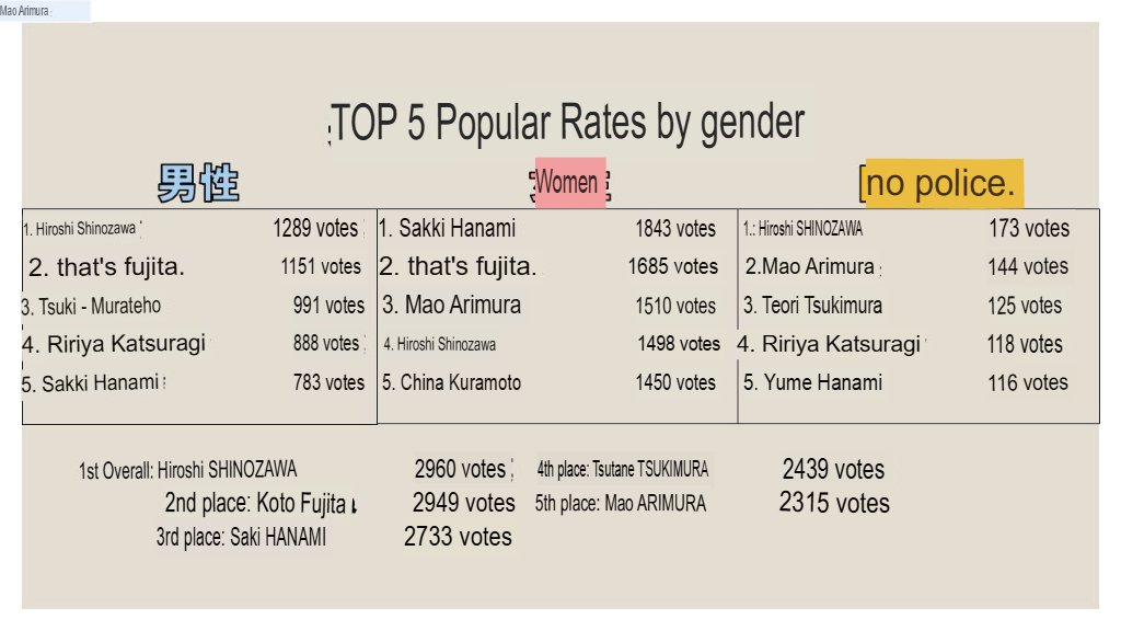 >>549024220Without the ratio, here's the top 5 in popularity by genderOverallHiro>Kotone>SakiMaleKotone>Hiro>TemariFemaleSaki>Kotone>MaoSeems that when the sample population are mostly women, Saki can actually eke out a victory to the top 3 however that's a pretty rare instance.