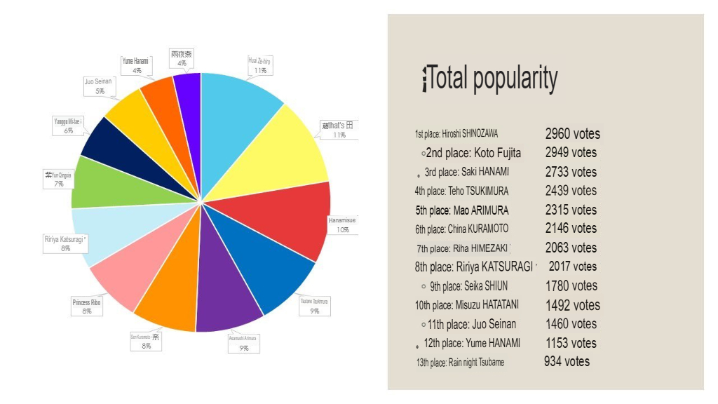 >>549024582And here's for overall popularity. Even if Tsubame has a high female ratio she's still last followed by Ume and Sena.>>549024430Yeah, I didn't even see Tsubame, Makes sense.