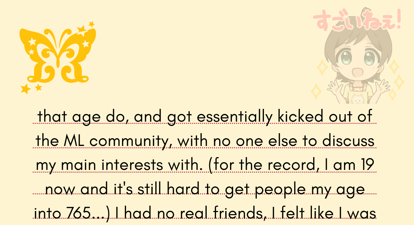 >>549015516I thought my answer was sort of long even after I trimmed the fat and the fluff but there are other anons who easily beat my word count. That said, as long as you feel that the answer you submitted conveys your reasons, that'd be enough.Now, if the question was something like "How did your idol(s) influence you after meeting them?", I'd probably go on a longer essay (rant).