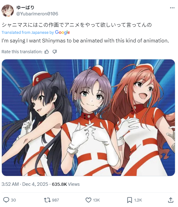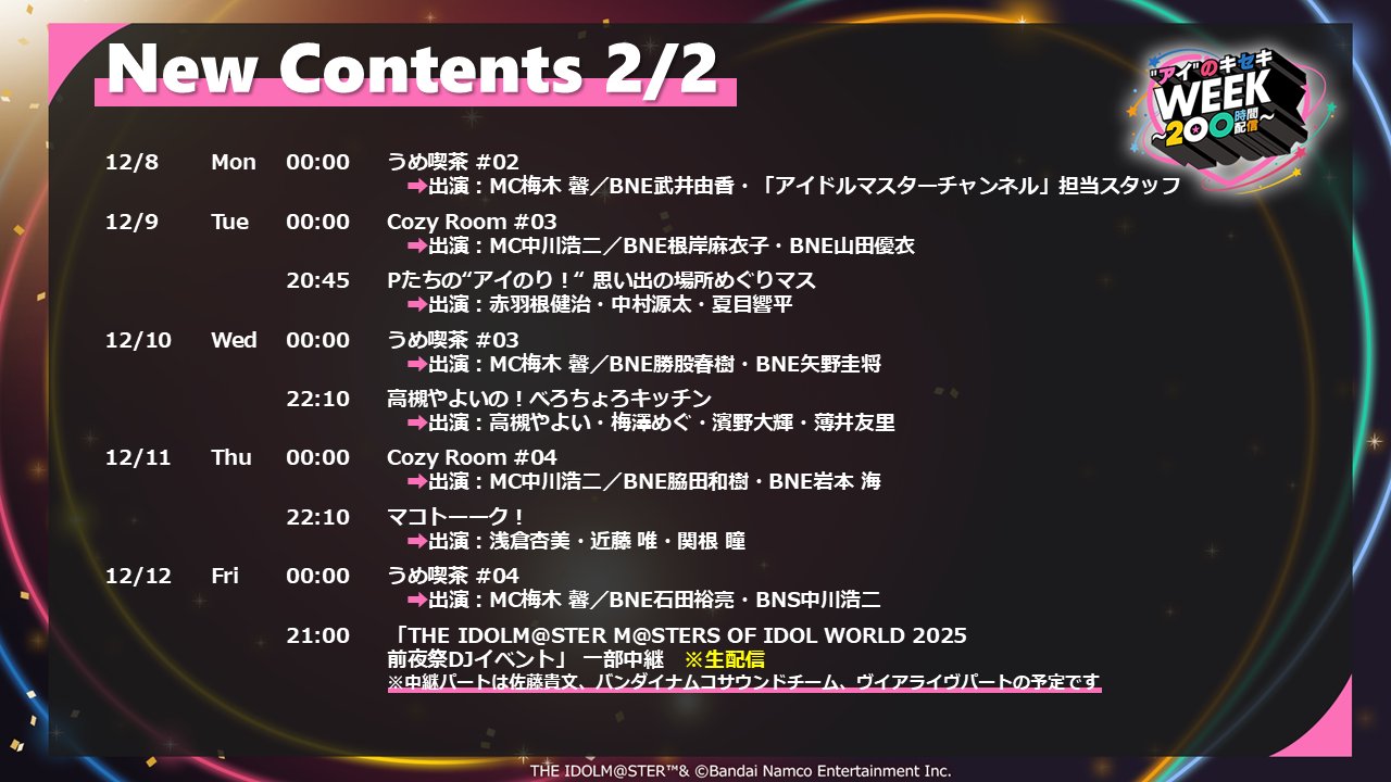 iDOLM@STER ThreadPrevious iM@S Thread: >>548937215Official website: idolmaster-official.jpJapanese news: imasnews765.comEnglish wiki: project-imas.wikiAPKs: apk.ksmz.moeOld archive of materials: sites.google.com/view/yukipobackupOld FAQ + Resource Links: pastebin.com/icRtaLvvMaterial translations + Music downloads: pastebin.com/DebHdukECharacter birthdays: pastebin.com/cLdezeDuNext thread OP: pastebin.com/A5UGxTuBHelpful Links: pastebin.com/Z70CGAsN>Event/Gacha Dates (Dec 5th): >>549009334 >>549009385- Previous News: >>548937246 >>548937280ONGOING:Dec 4th, 3PM JST to Dec 12th, 11PM JST: M@STERS OF IDOL WORLD 2025 "Ai" no Kiseki Week 200 Hour Stream: youtu.be/Z3FdRSk6uc0TODAY:Dec 5th: Gakuen Chibigurumi vol.1-4 on Namco Online Crane: >>548496095Dec 5th to Jan 4th: ALLSTARS x Space Create Jiyukukan collab: >>546351567Dec 5th to Jan 5th: Shiny Colors x Ekimemo collab: >>545981864 >>546072240Dec 5th to Jan 12th: Shiny Colors Straylight x AXGRIT collab at Ebisubashi Tsutaya: >>545612439 >>547673851Dec 5th to Feb 15th: iM@S TR@VEL MEDLEY!!!!!! x M@STERS OF IDOL WORLD 2025: >>544505252 >>544365560TOMORROW:Dec 6th, 10PM JST: VL Cosmo Free Talk Stream: youtu.be/i54mcLJjpI0