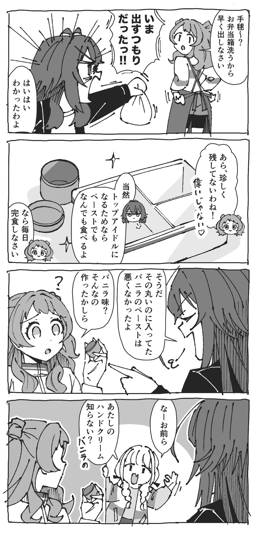 >>549103156Saki: Temari~? I'm about to wash dishes so hand over the bento boxes alreadyTemari: I WAS JUST TAKING THEM OUT OKAY!?Saki: Yeah, yeah, whateverSakinui: Ara, there aren't anything leftover, that's rare!>I'm so proud (heart)Temanui: Of course, if it meant becoming the top idol I'd eat anything, even pasteSakinui: Then why not finish everything everyday?Temari: Oh right, that vanilla paste that was in that round thing wasn't actually bad at allSaki: Vanilla? Did I even make something like that?Kotone: Heeey you guysKotone: Have you seen my hand cream anywhere? It's vanilla-scented