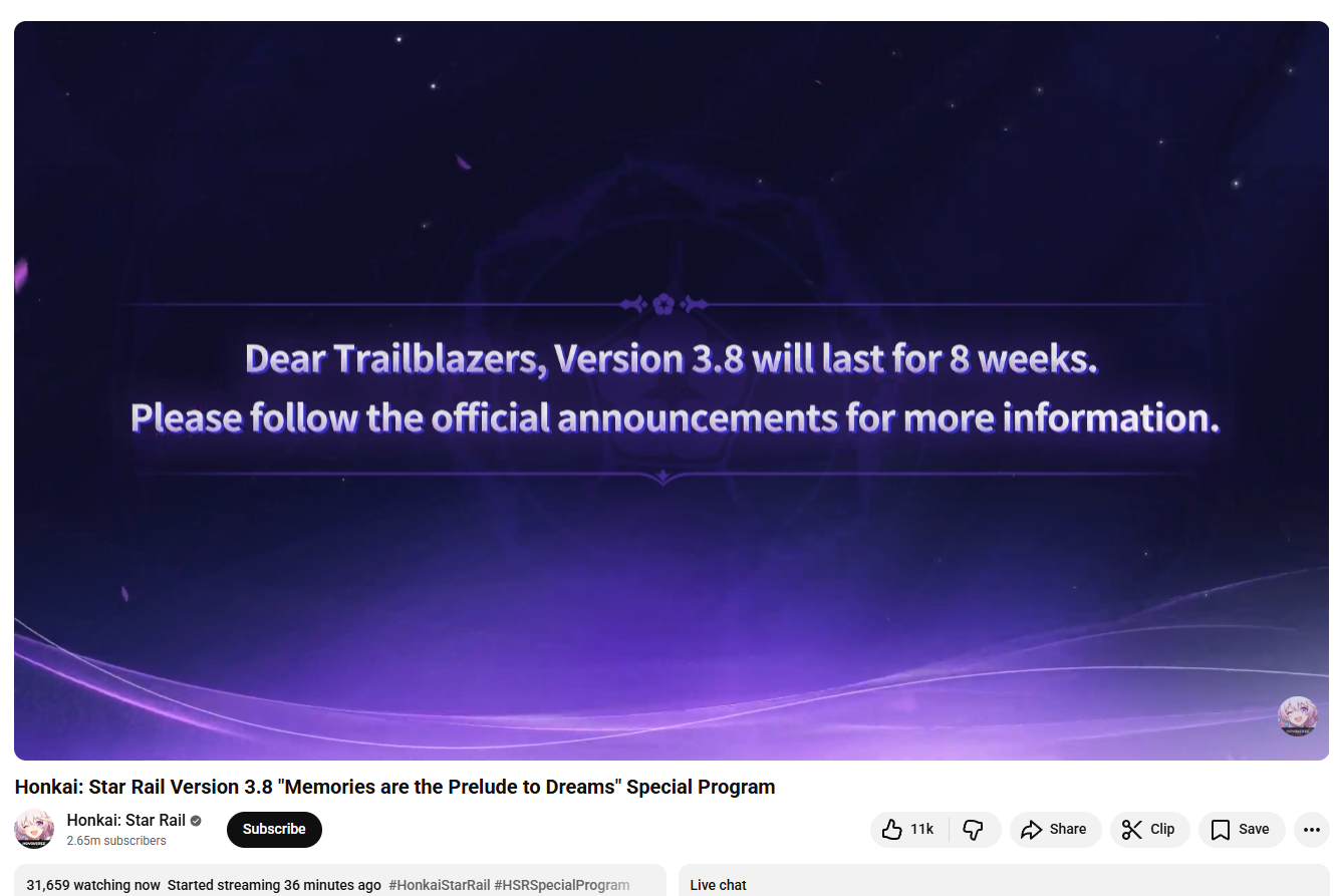 Previous: >>548994331Livestream codes>PS3QWS3ACGDK>Version 3.8 "Memories are the Prelude to Dreams" Special Programhttps://www.youtube.com/watch?v=VrSInGzFFKshttps://www.youtube.com/watch?v=fl5--WIcpCk>Download - https://hsr.hoyoverse.com/en-us/home>3.7 Preview Page - https://act.hoyoverse.com/puzzle/hkrpg/e20251024vesion_1316/index.html>Version 3.7 Trailer: "As Tomorrow Became Yesterday"https://www.youtube.com/watch?v=r4gljUbCzqAhttps://www.youtube.com/watch?v=-L1PxKwvJ74>Cyrene Character Trailer: "With You Once More"https://www.youtube.com/watch?v=CRAuK8T6Xishttps://www.youtube.com/watch?v=rtSkMbDs1Xw>Golden Epic Trailer: Farewell, Cyrenehttps://www.youtube.com/watch?v=Sn901sn5_B0https://www.youtube.com/watch?v=zHFGsd-KsX0>Animated Short: "Hello, World!"https://www.youtube.com/watch?v=LB_65-rOYYohttps://www.youtube.com/watch?v=_GG4BgkyRiY>Myriad Celestia Trailer — "Exotale: Scene 8"https://www.youtube.com/watch?v=x3bRer52asEhttps://www.youtube.com/watch?v=owFII5A3OfE>Current Character Banners: Cyrene, Phainon, Cipher, Mydei + Pela, Lynx, Moze - https://www.hoyolab.com/article/42482837>New Drip Marketing:>The Dahlia (5* Fire Nihility) - https://www.hoyolab.com/article/41861857>Redeemable Codes - https://hsr.hoyoverse.com/giftJS2QEA3SDHFKSTARRAILGIFTSTORYOFLOVEOMEGA>/hsrg/ Tools & Resourceshttps://rentry.org/hsrg-resources-14>/hsrg/ Thread Templatehttps://rentry.org/hsrg-thread-template-14