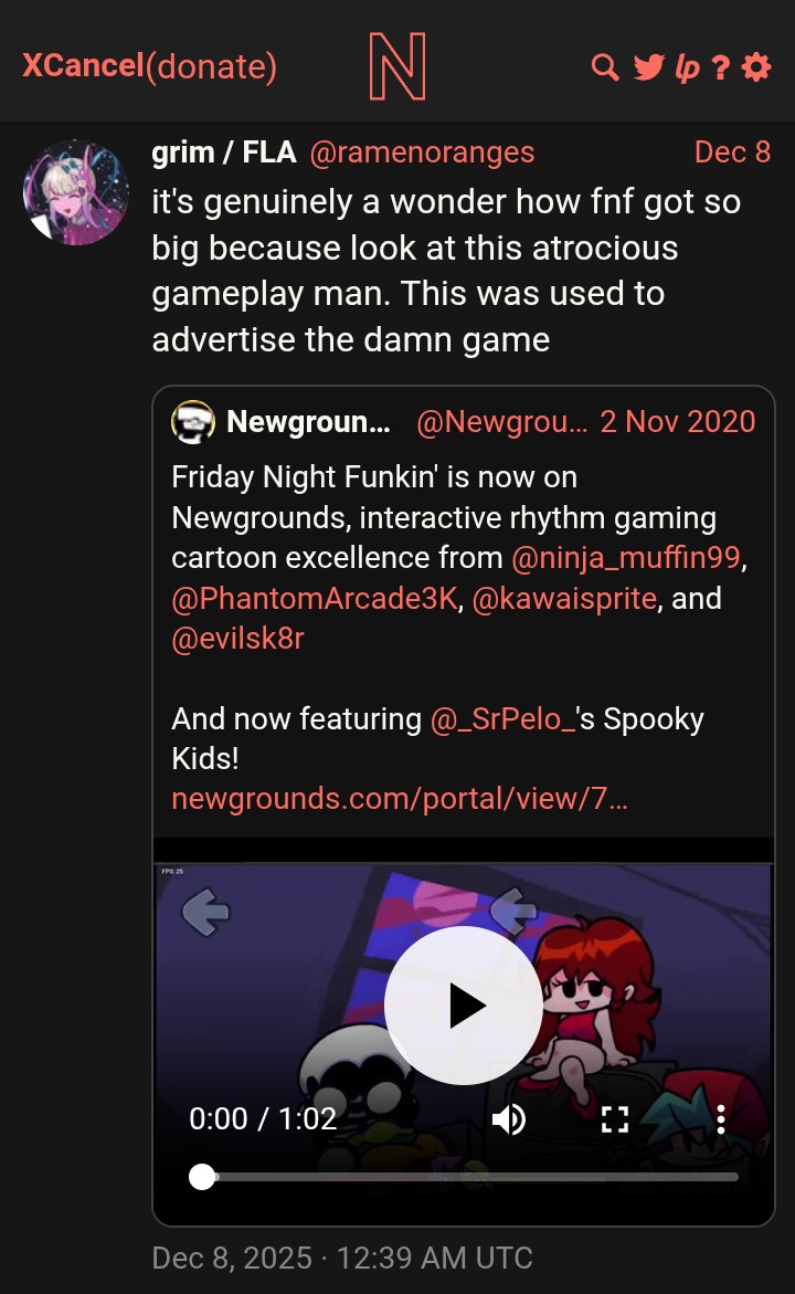 This is the Friday Night Funkin' General.Discuss the game, fan-made creations, & series that have crossed over with Friday Night Funkin':>TANKMEN>Pico>Madness>Spooky Month>& MoreDrama and E-celeb shitposting is not allowed.Week #2890 - New Record Edition>NEWS:>PITSTOP 2 HAS RELEASED!https://x.com/FNF_Developers/status/1906786626614735022>Rift of the NecroDancer Collab announced! Releases on December 10th!https://x.com/necrodancergame/status/1996291320294551956>Mobile Port Releasehttps://www.kickstarter.com/projects/funkin/friday-night-funkin-the-full-ass-game/posts/4153477>Funkin Crew's most recent blog posthttps://funkin.me/blog/2025-08-23/>Ninjamuffin & PA did an AMA on /funkg/https://rentry.org/qf7r4h5o>Phantom Arcade's stream summarieshttps://rentry.org/pnkn5>Download/Play The Game:https://ninja-muffin24.itch.io/funkinhttps://www.newgrounds.com/portal/view/770371>Modding Community:https://gamebanana.com/games/8694https://gamejolt.com/games/tag-fnf>Modding Help & Resources:https://github.com/FunkinCrew/funkin-resourceshttps://rentry.org/funkgmoddinghelp>/funkg/ Mod Wiki:https://funkinchan.fun/index.php/Main_Page>/funkg/ Link Compilation:https://rentry.org/funkg_link_comp>OP Template:https://rentry.org/funkg_op_template/>Thread Theme:https://youtube.com/watch?v=7l6Ch6FQfoMLast Week: >>548738547