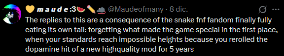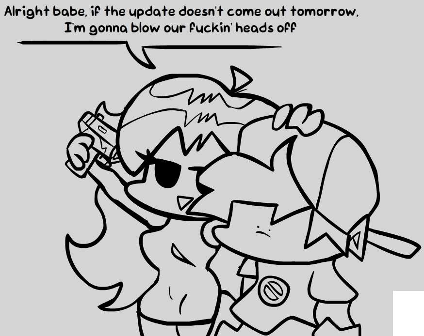 idk why r u guys so upset about the devs getting focused at other stuff for fun rather the main point that is week 8 if none of you will be so excited when it comes out anywayalso did y'all really expected for this collab at least remixed most of the songs or having the entire ost in necrodancer like week 4 lmao