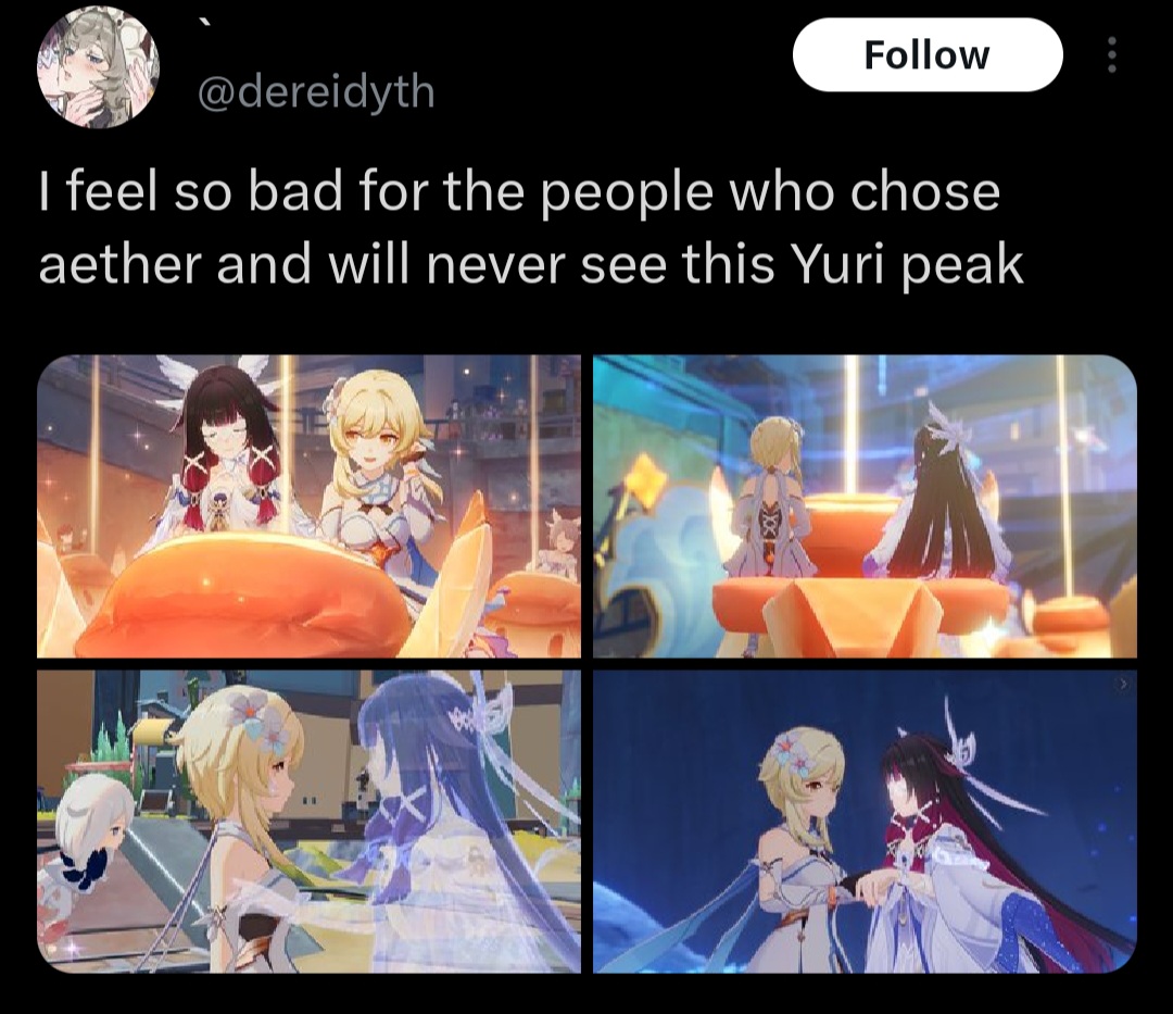i kinda wish i chose aether instead of lumineits not the aetherpag stuff i just thought lumine was the canon choice of the traveller but i keep getting reminded that it isnt and it bothers me