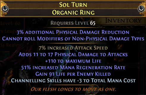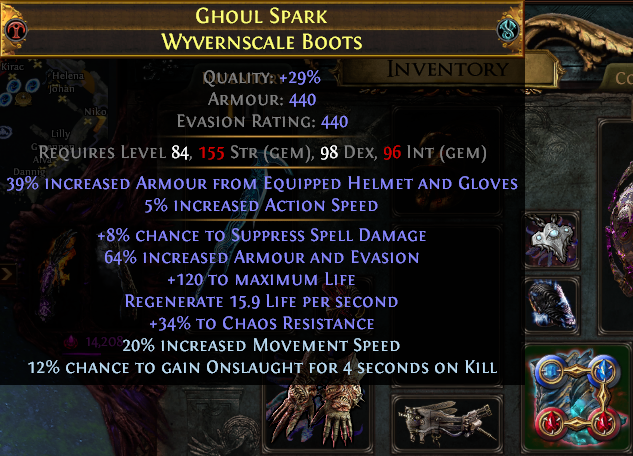 >guy showing he's got a ton of HoM cards>ask for them>obviously not given them>ask people about boot crafts a little later>he messages me and offers me 1 HoM if I craft my own decent boots >ask about Armor/Evasion bases>recommends Wyvernscale>pick up a 29% quality for 10c>Deafening Envy and get 34% Chaos Res, 8% Spell Suppress, and 120 Max Life>craft on Movement Speed + Onslaught (8 tries for max rolls)>use only a few embers/ichors for the implicits>exalt and get increased armor/evasion t4>he gives me the cardI feel genuinely proud i made decent boots for myself. I was able to drop my Cogwork Ring and pick up a really nicely rolled Woespike since I'll be putting more Impale in the build later (likely after changing sword to a rare, even if I think Varunastra is the coolest shit on the planet)