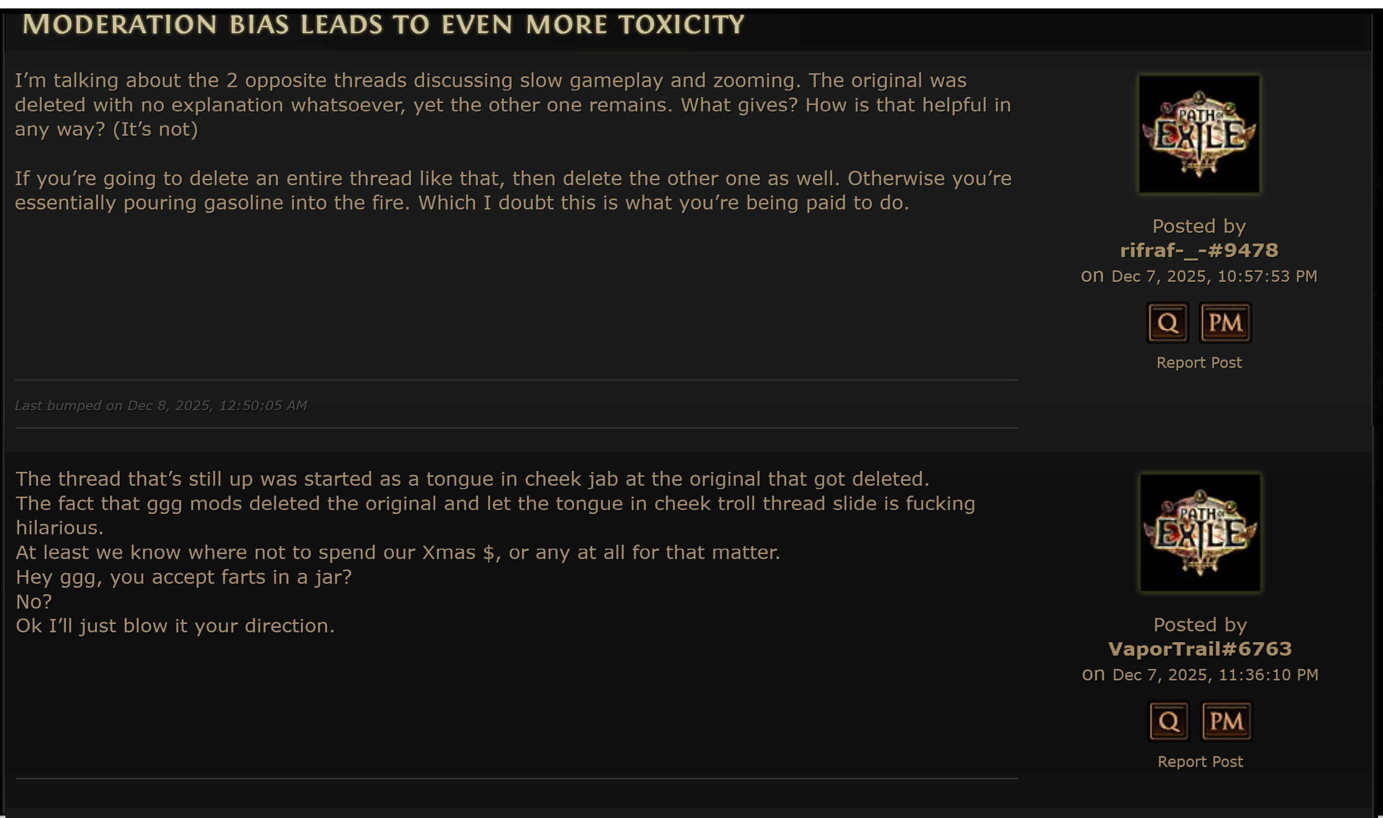 Why are PoETwo'ers so upset that GGG upheld moderation on their website and didn't let insulting and arguing in bad faith, + spamming ruin their forums? PoETwo'ers should respect GGG and the rules they set.