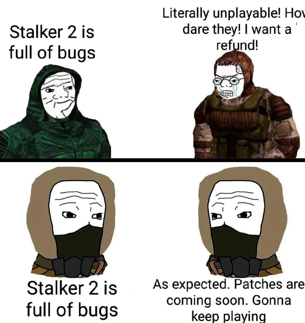>2025>Stalker 2 is what it is>GSC is officially endorsing mods now>The mods in question are Anomaly and Gamma>Gamma becomes a de facto fourth/fifth part of the series because everyone shills it and recommends it to newfags >Western modders care only about Anomaly>Only Russian modders do other shit>But GSC condemns Russia and everything related to it for obvious reasons>And Russia officially condemns GSC and Stalker>Russian mods will never become popular among the general audience>For the majority of people, Stalker as an IP is defined by the mess that S2 is and Gamma >Average contemporary English speaking Stalker fan only knows about Anomaly, Gamma, maybe Radiophobia because they wouldn't touch SoC in 2025 in any other way>A potential Netflix series is being considered, the consequences of which are difficult to predictHow do I leave this timeline or how do I stop caring about the state of Stalker, it's not that easy to do, it's my main hobby, it causes me genuine internal pain.