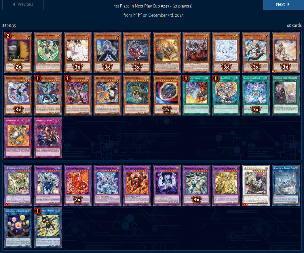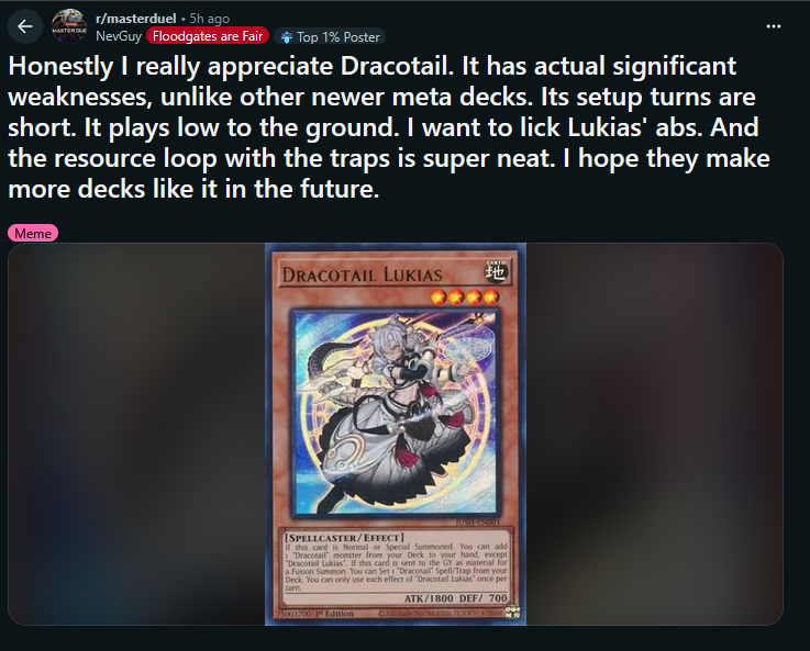 It soothes my heart to see that decks like these are doing well in the OCGDracotail is unironically the best thing to happen to yugioh (and MD) in a very long timeKonami I'm 100% down to ban anaconda and limit branded fusion back to 1, but if you kill off the deck after duelist cup I'm fucking done with this game forever because you just KNOW next month we're going right back to yummy misturugi combo vomit either way