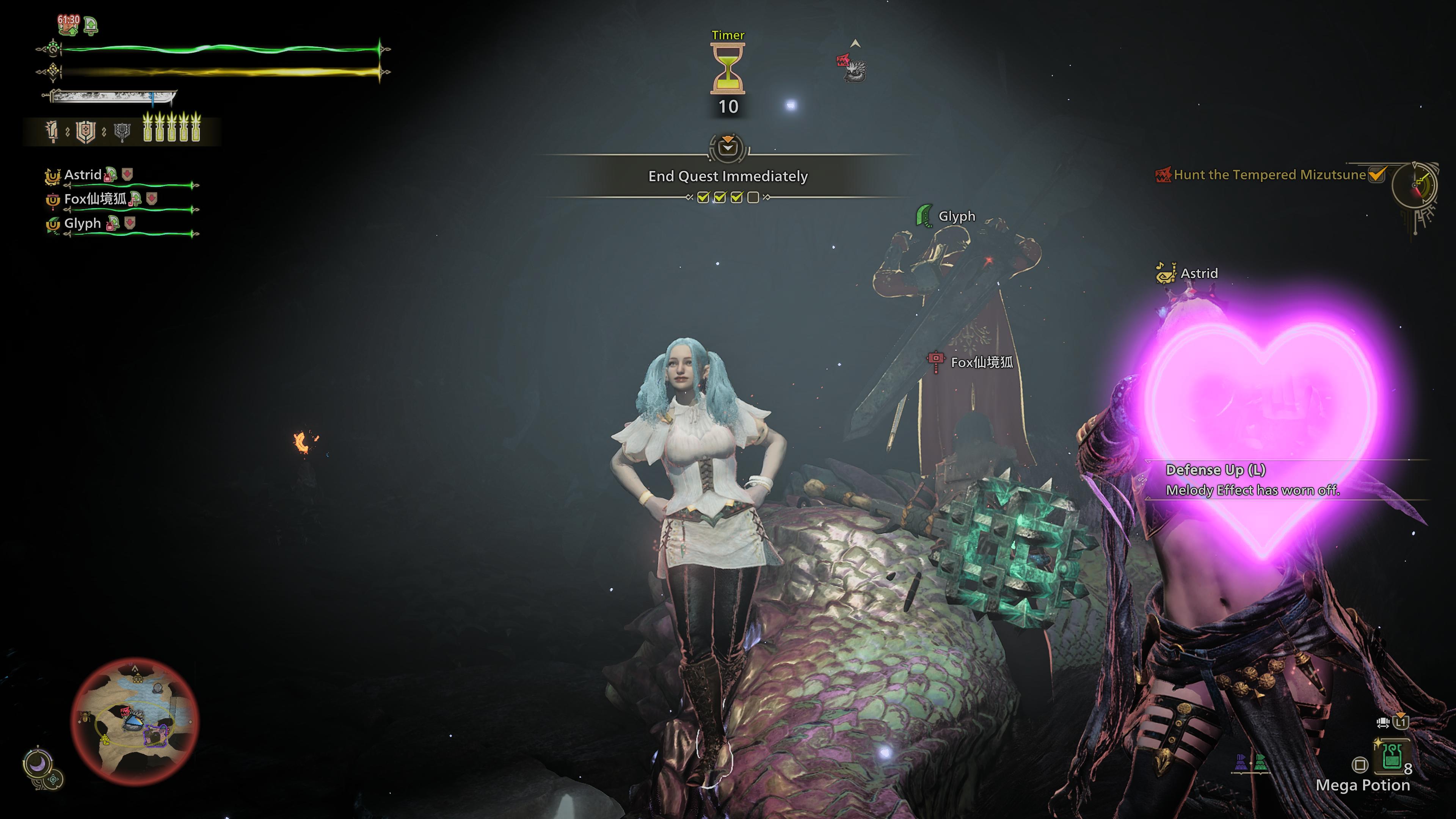 >evade window 5>divine blessing 5>health boost 3>stun res 3>full fatalis armor>healcat: ACTIVE>temporal mantle: ON>healing augment: ACQUIRED