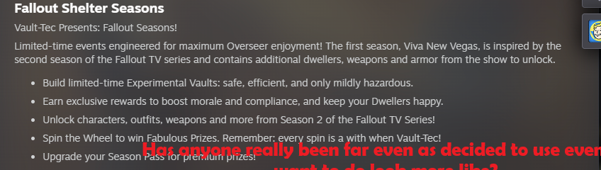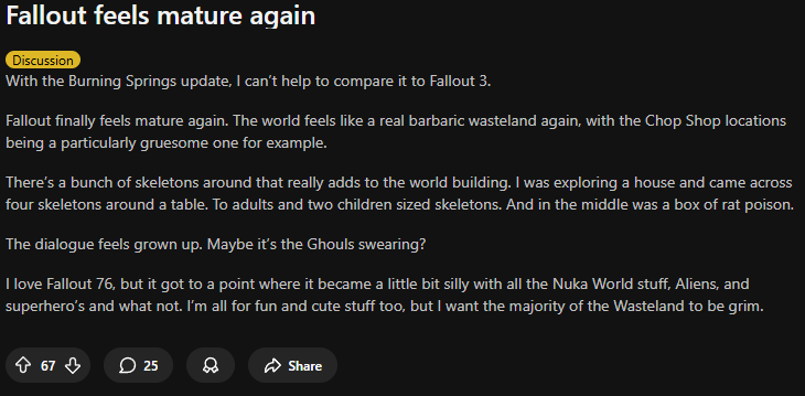 >>549589130The rewards for the scoreboard are pretty shit. There's some nice stuff here and there but the raider theme isn't for me. Didn't even start the new bounty quests, just couldn't be arsed to do it. I'm a New Vegasfag first and foremost so I will claim those nostalgiabait rewards, but the vibe of the new map wants to be NV so bad it's embarassing. I just see THE GHOUL ™ and cringe