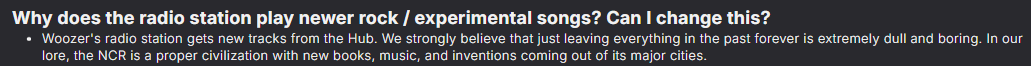 >>549965893The overall quality is higher than the legion one.But so far it seems more tailored towards people who have an uncritical love of the NCR. All of that criticism of liberal democracy and human nature is out the window in favor of how cool rangers and troopers are. That lack of criticism and cynicism really makes it feel like a mod in the worst ways compared to base FNV NCR stuff.