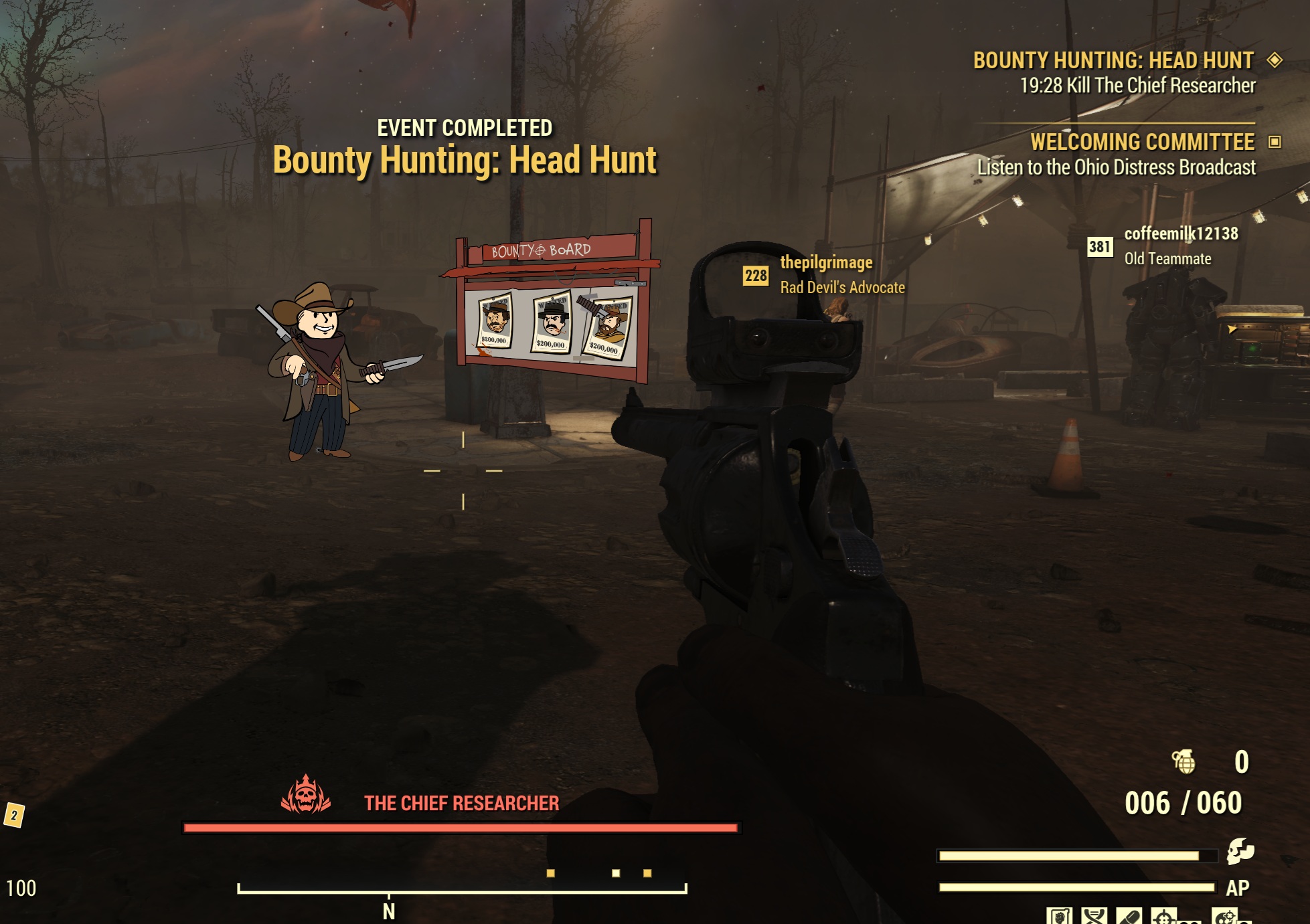 >>549973168I finally got a bounty hunter boss to myself (there were like 10 other people there but they were roaming around and I found the bounty in a warehouse)It was kind of disappointing when they died in less than one enclave flamer mag