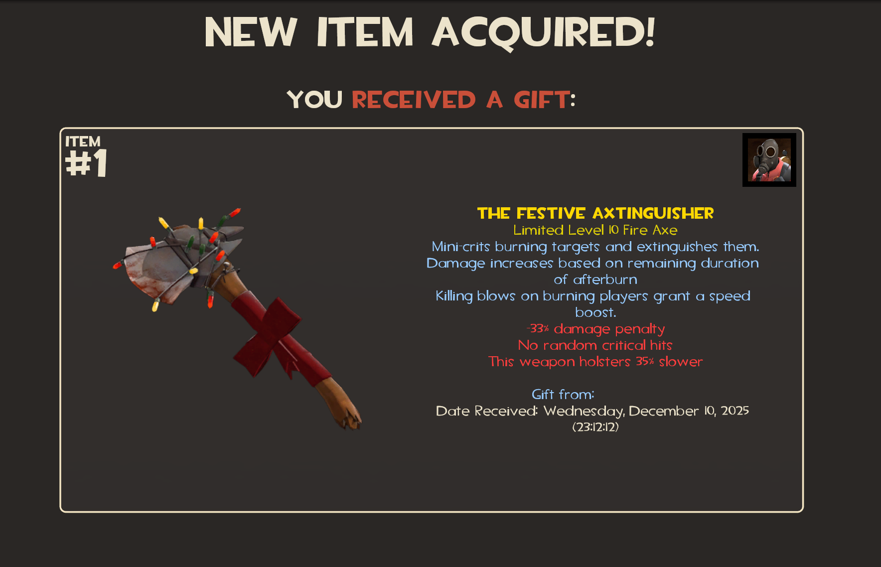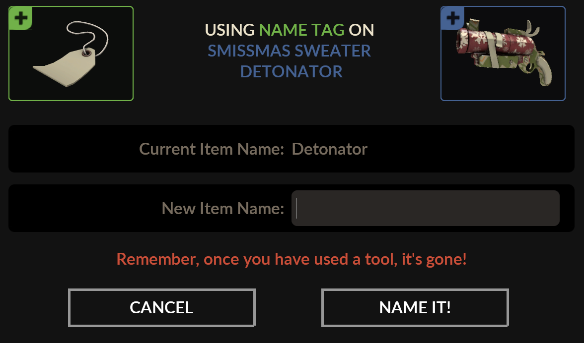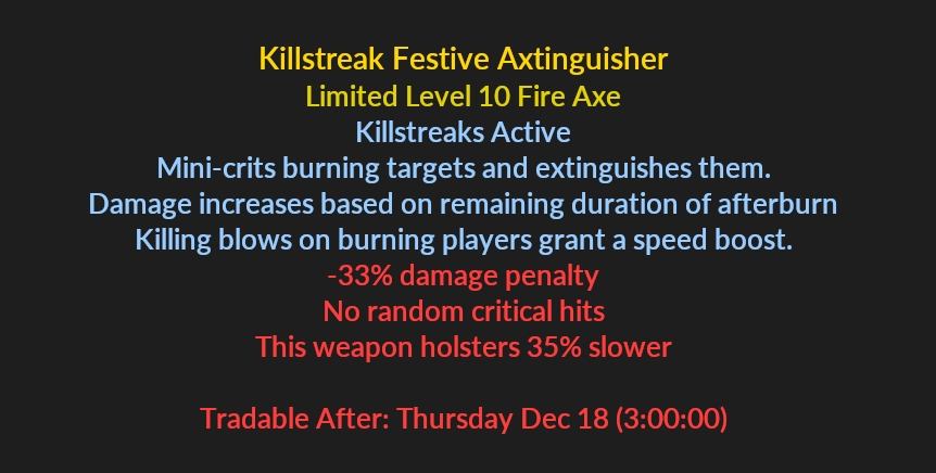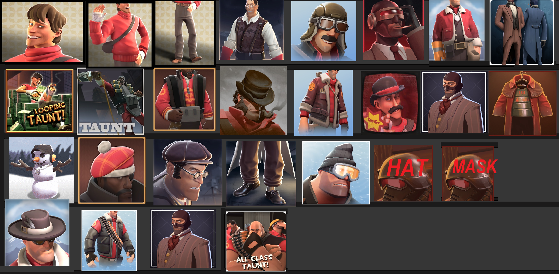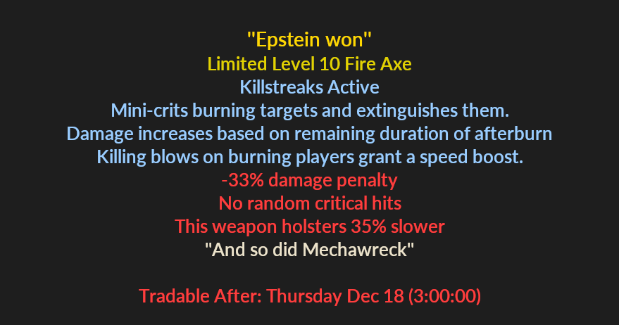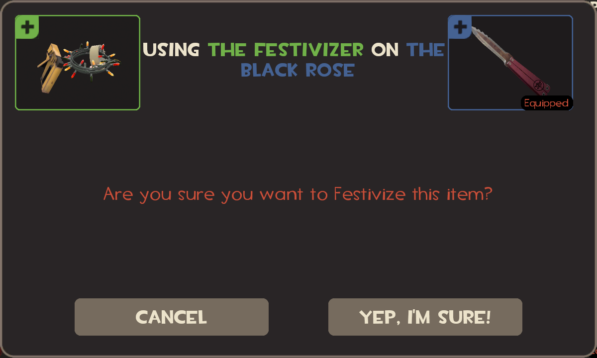 >>549796723Fair, I did. Trimping next event.>>549786117Direct Hit won, all hail our tournament format for the end of year Tournament.As usual steam shopping sprees will be hidden behind prizes on the board, with the crap tools guaranteeing sprees and the taunts guaranteeing not having anything behind em. As always we'll be playing December 31st, starting at 6pm this year. Loot board is here>>549581683