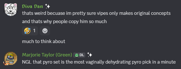 >>549782351>NGL that pyro set is the most vaginlly dehydrating pyro pick in a minuteGuys itโs only slop when itโs not out items!