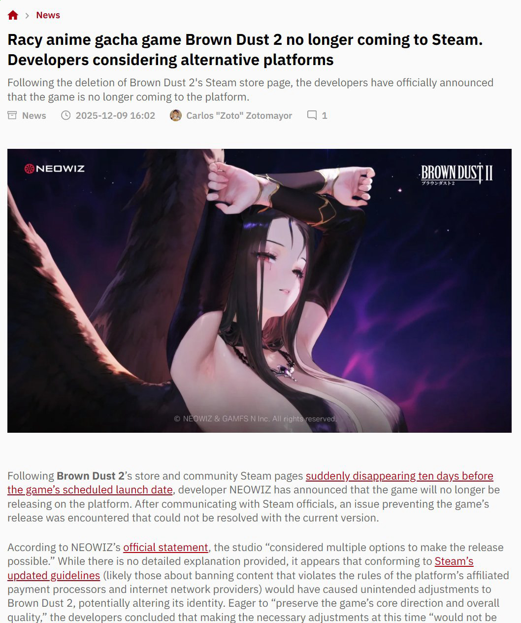 So Neowiz's Brown Dust 2 is not going to be on Steam.On on hand, trying to game the wishlist system by offering rewards is a clear Steam violation.On the other hand, I've heard privately from developers a different story:For years now, Steam has had a dual class system. Adult or racy content is allowed, but has to be labeled and the algo will bury it.If any game tries to straddle that line, being suggestive without being adult, Steam hates it. They want to force you to use the adult label and be put in the 2nd tier of games on the platform.And there is a lot of pressure on devs to do this, and even if you change content to try to escape the adult label, devs have told me that rarely works to convince them once they have made up their minds.This might account for the Neowiz decision.