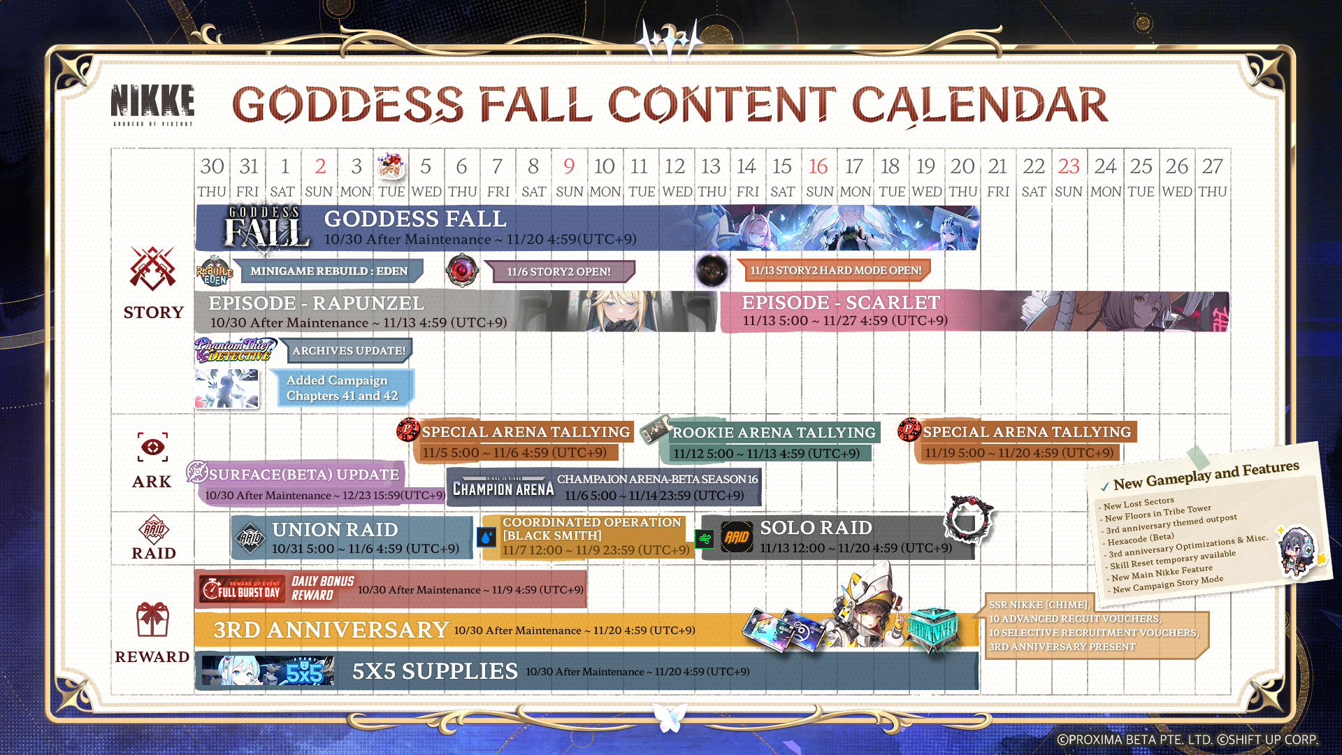 >3 more dead weeks until Anis banner>Game Download - Android/iOS/PChttps://nikke-en.com/index.html>General Info/FAQ for New Playershttps://rentry.org/NikkeInfo>Additional Linkshttps://rentry.org/nikghomeALL DATES/TIMES LISTED BELOW ARE UTC+9 (KOREA TIME)>Update on December 4https://nikke-en.com/newsdetail.html?content_id=254d33c5af95fa4a26aa933a5020c508da59>Developer's Note: September 2025https://nikke-en.com/newsdetail.html?content_id=c232f813ac34aa45c4aa3c1a8d6daec562db>Latest Developer QA interviewhttps://pastebin.com/M0E4MDUq (embed) (embed) (embed)>Current EventsTERMINUS TICKET - December 4 ~ December 30>Upcoming EventsSolo Raid: Alteisen - December 11 ~ December 18>Current Special RecruitsDiesel: Winter Sweets - December 4 ~ December 25Maiden: Ice Rose & Guillotine: Winter Slayer [Rerun] - December 4 ~ December 25>Upcoming Special RecruitsBrid: Silent Track - Dec 11 ~ Dec 31>Current Costume PassesBlanc: Fortune Express [Gacha] - December 4 ~ December 30Bready - Frosty Bite [Mission Pass] - December 4 ~ December 30Emma - Color Me Red, Vesti - Ark Mage & Volume - Beat the Gun [Shop rerun] - December 4 ~ December 30Jackal: Class Troublemaker [Mission Pass] - Dec 1 ~ Dec 31>CodesNIKKEASSEMBLE3RD3YEARSWITHNIKKEGODDESSASSEMBLEPUNYQUEENIAMNAYUTA3YEARSWITHCOMMANDERthxfor990000thxfor980000thxfor970000thxfor960000DWAVECOMINGPrevious: >>549556765