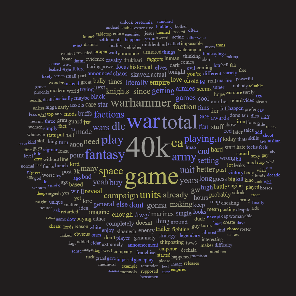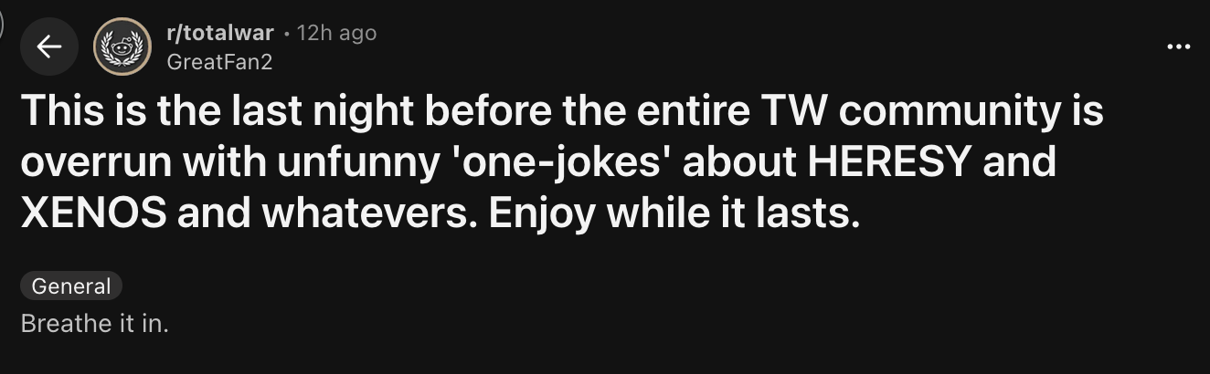GOOD MOOOOOOOORNING /twg/! Just wanted to remind you that we’re another day closer to 40K (yes, THE 40K from Games Workshop) getting confirmed in Total War! Make sure to save your tears for the upcoming TGA when Space Marines walk into the spotlight!>H-HAH! VALRAK SAID IT WOULD BE ANNOUNCED AT THE ANNIVERSARY STREAM! HE WAS FINALLY WRONG! TOTAL WAR 40K ISN'T HAPPENING!!!!!“No!”Yikes! That’s a large assumption. How can one “questionable” prediction instantly invalidate a history of success? Unlike your “Star Wars leak” forumcucks, 40K has a lot more distribution among other leakers. Ever heard of Volound, 7chan, and 5channel? And while you’re busy obsessing over Valrak, care to explain how come there are files in the new engine called 40K? Seems a bit suspicious if you ask me, but feel free to continue your denial. Your tears of disappointment will be all the more sweeter!