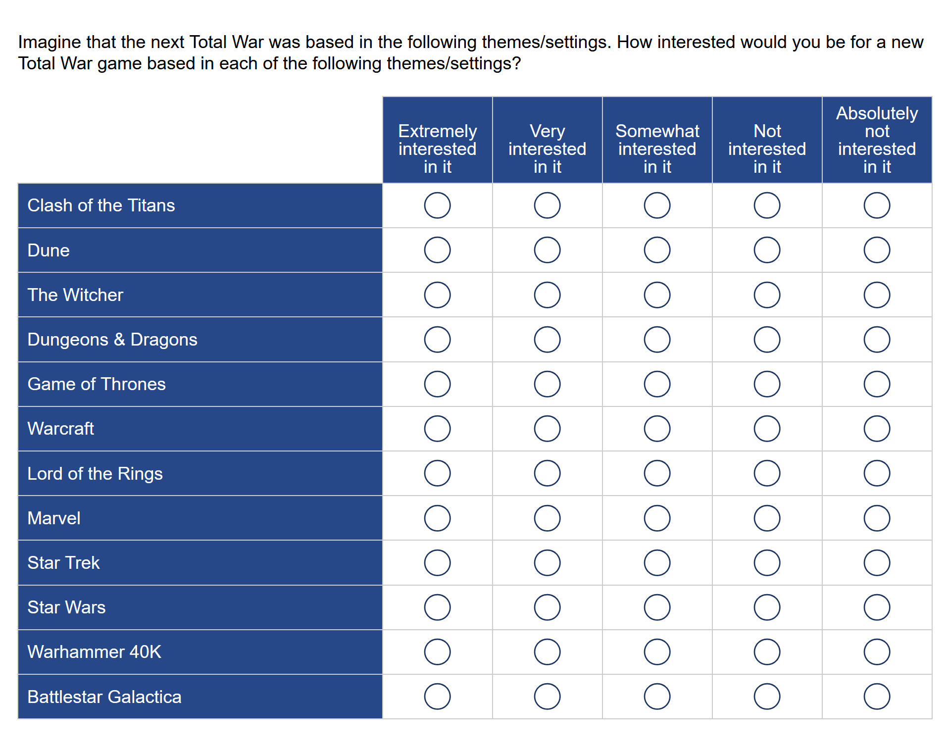 >>549786912Acceptable and interesting settings for a historical TW>Medieval Europe, either high or late era>30 years war>Rome, either early republic or later imperial erasThat's about it unless you want to go more modern too