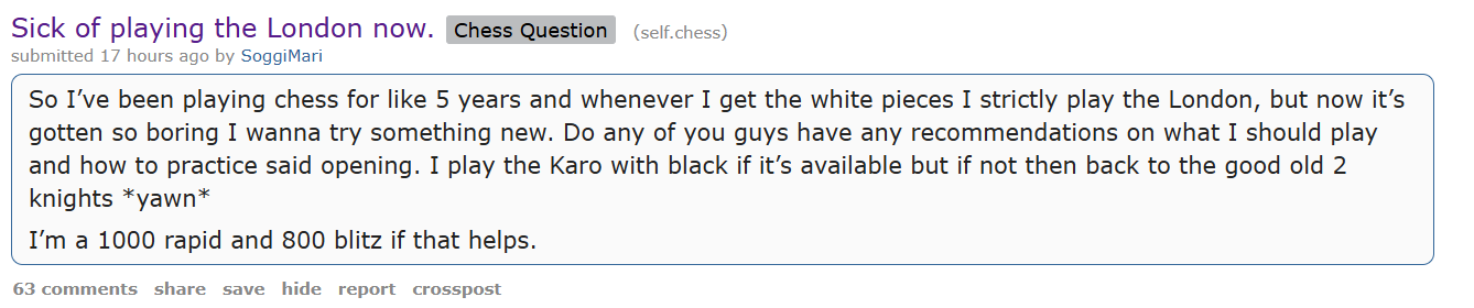 >>549761245Hey man, you know what, challenge accepted. Life is already so damn boring I'm not going to make it any more dull by playing some gay ass London or Colle system as a beginner anymore. I'm tired of that shit. From now on, every game I get a chance, I will be playing these two. Now for the questions. Any ideas for something similar to the Latvian Gambit against D4? Also, what should I go for in case my opponent doesn't go E5 (sicilian/french as an example)?