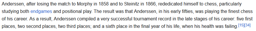 >>550128357Anderssen won London 1851, the first international chess tournament.I agree that Anderssen's best came later.