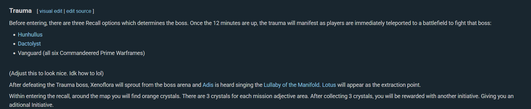>>549778031If you don't like perita then you just don't like playing the game.You sit in your orbiter, for hours, making new fashionframe bullshit and scanning your different chat channels before reluctantly doing incursions or relics for a few missions before logging off.Meanwhile, I enjoy the wonderful music and wartorn vibe, while killing grineer with my Hate, stacking furious javelin on 20+ enemies at once to annihilate anything in my path.