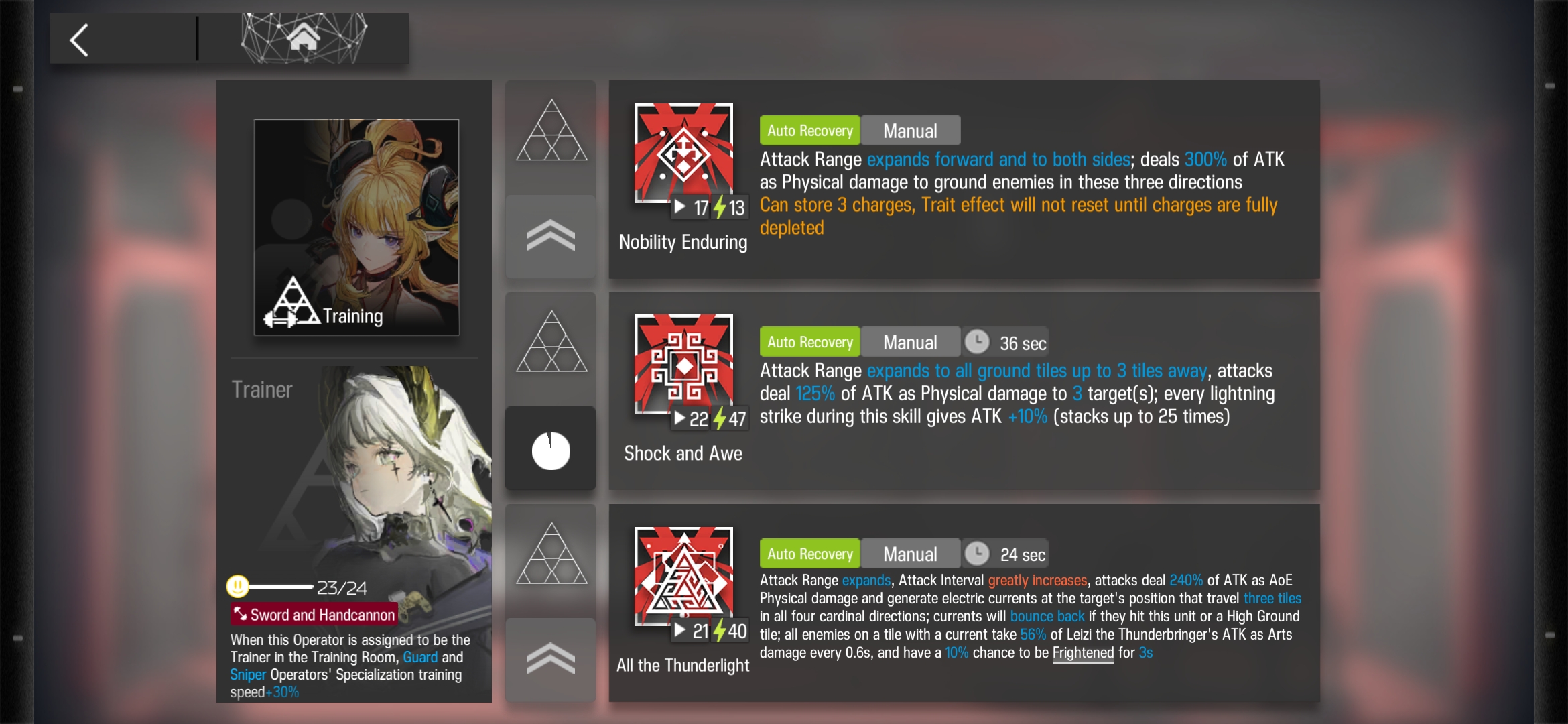 >>549758246S1 is the reason why you would use her over Mlynar so yeah you can just do thatS2 and S3 are Mylnar S3 but split into two different parts so its kind of weird. S2 is great at AOE but doesnt do maximum damage/cant hit over high ground tiles (the range is only on ground tiles). S3 does a fuckton of damage but you ironically need highground tiles for it to work (the lightning bounces off walls).Protip: if Leizi lands directly on top of an enemy, they'll get hit 3 times because the projectile all spawn at the same time on the tile. Thats why its called the buttslam