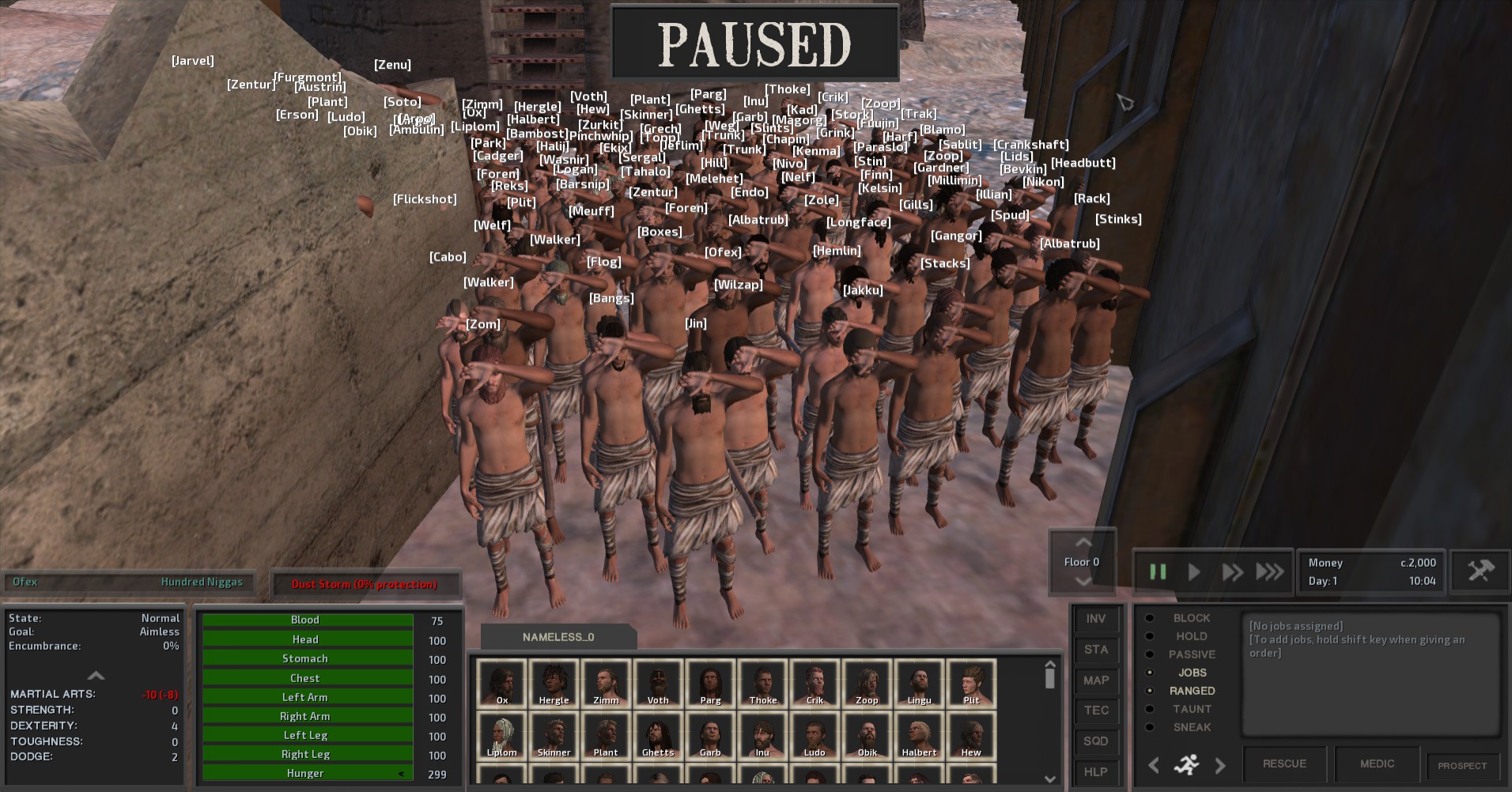 Poor Rhamiel. He doesn't realize that I already knew he was hiding at this farm, and the only reason I haven't wiped him out, is I suspect the farm would end up in the hands of the local cannibals, and I'd much rather be free to periodically loot him.
