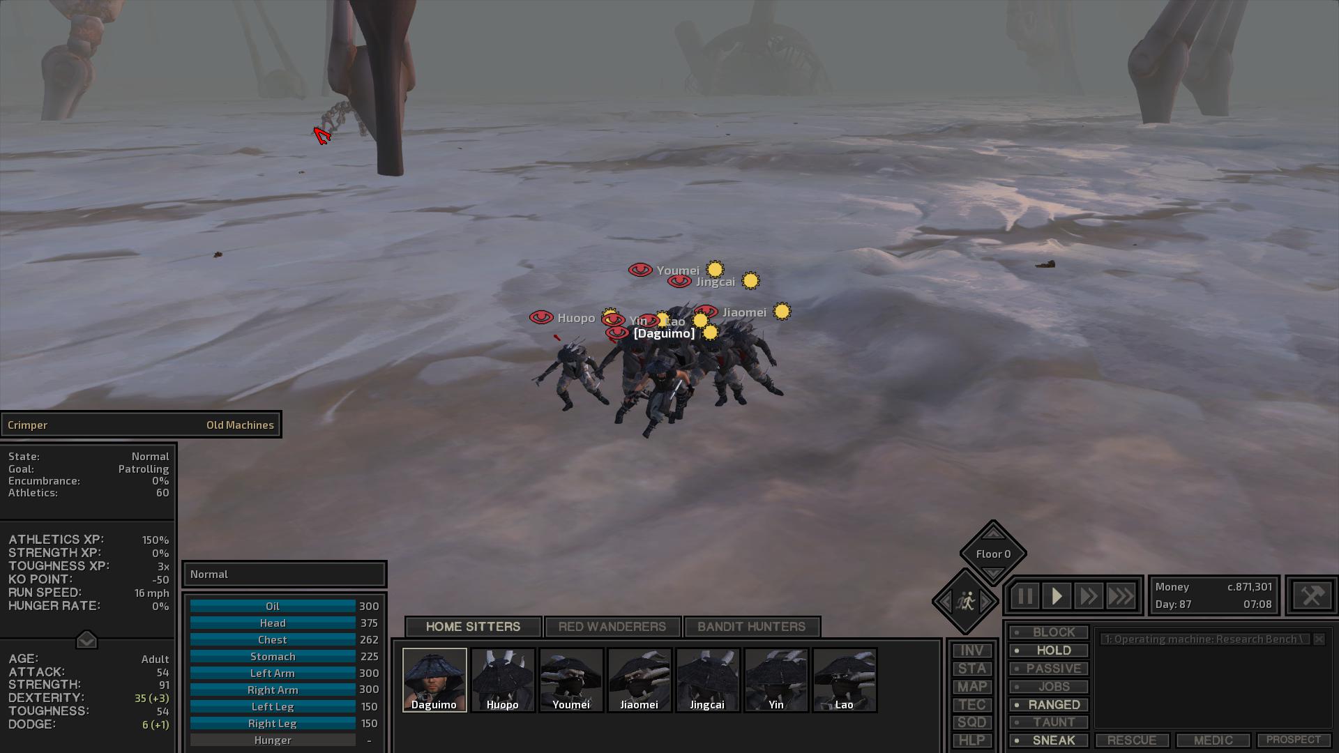 Growing increasingly disenchanted with trying to mine north of Bad Teeth. Thinking about dismantling all structures to reclaim the materials. Sure, there are 3 copper nodes and 2 iron nodes right there in the field, but I can't build the barrier walls I want because it's all too near to the city, and I can't build machinery next to the nodes because of the city, and the buildings in the city are too small to just put the machinery in there. Not to mention the crazy amount of materials it apparently requires to build the chain of required equipment. I'm going to have to approach this differently. And since I can't get the walls I wanted in place, I keep getting attacked. I've been winning, but they are chipping away faster than my team can heal. The only positive is an occasional boon of meat and hides. Bottom line is I probably need a simple farm somewhere.