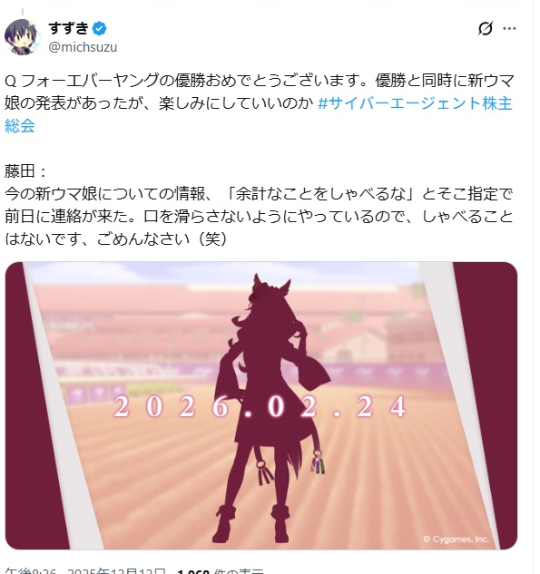 >>549875174Cyber Agent shareholder meeting just happened, so I believe it. There's this nice tidbit about the new CEO, too>そして、本業だけでなく麻雀、競馬、サッカーなど、自身が関わったあらゆる勝負事で結果を出してきた勝負師である藤田氏にとっては、次期社長の山内氏が持っている見逃せない特徴があるという。>「意外と、と言うと変かもしれませんが、山内は『勝てそうな顔』をしています。これは大事なポイントで、勝負弱そうな人って、なんとなくわかるんですよ。優秀なエリートでも、競合相手として全く怖さを感じない人もいれば、一見頼りなさそうでも『なんか嫌だな』と相手に思わせるタイプもいる。僕は社長に就くのは相手が脅威を感じるタイプであるべきだと思っています。社長が勝負弱いと、本当にどうしようもない」Seems like the guy's a gambler, too. So hopefully he'll continue the keiba department.