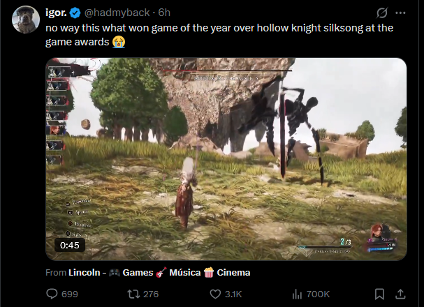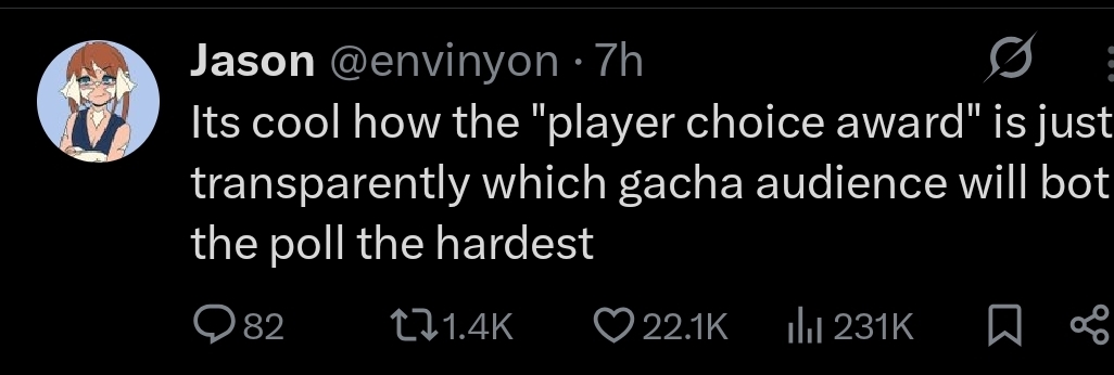 >>549870236Lies, you know you're not this salty in order to defend the Frenchman gameBesides, they got plenty of awards, which everyone knew it was getting, so giving it the player vote was not a very popular choiceShoulda went to silksong tho