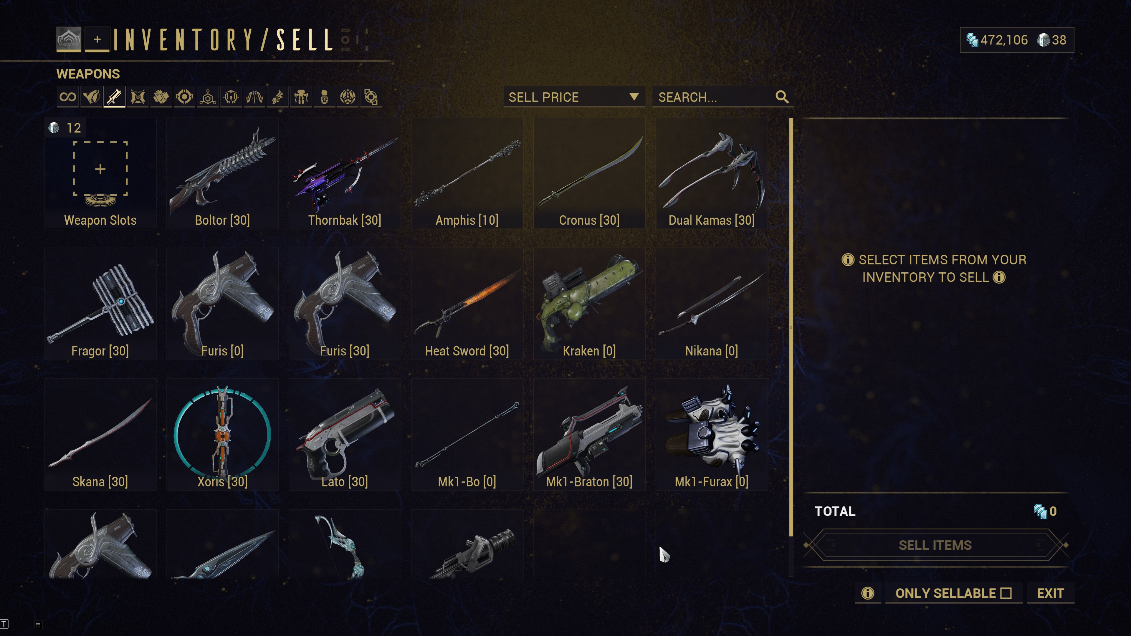 >>550015827>sell mk1 whenever you're done with them>sell basic weapons when you have their prime/variant>sell unused weapons when you need the space>check the wiki for prerequisite weapons to craft